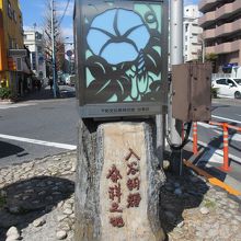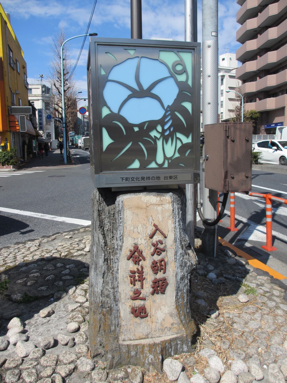 JR鶯谷駅から7.8分ほどのところ、昭和通りと言問通りが交わる交差点に立つ歩道橋の下に立っています。7月に行われる朝顔市は、鶯谷駅とこの碑の間で行われます。碑は2mほどのもので、上には朝顔が描かれたプラスチック製の絵が乗っています。昔は朝顔を栽培していた地だったということですが、朝顔市で賑わう会場に立つには趣に欠ける碑だと感じました。隣には乾山窯元之碑も立っています。