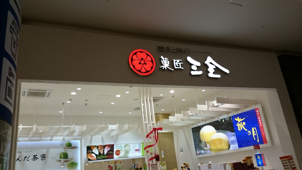 宮城県内にはたくさんある菓匠三全がイオンモール名取にもあります。こちらの店舗はわりと広く、空港にも結構近いので、仙台空港内よりお土産が買えると思います。定番中の定番ですが、萩の月はやはりいいと思います。