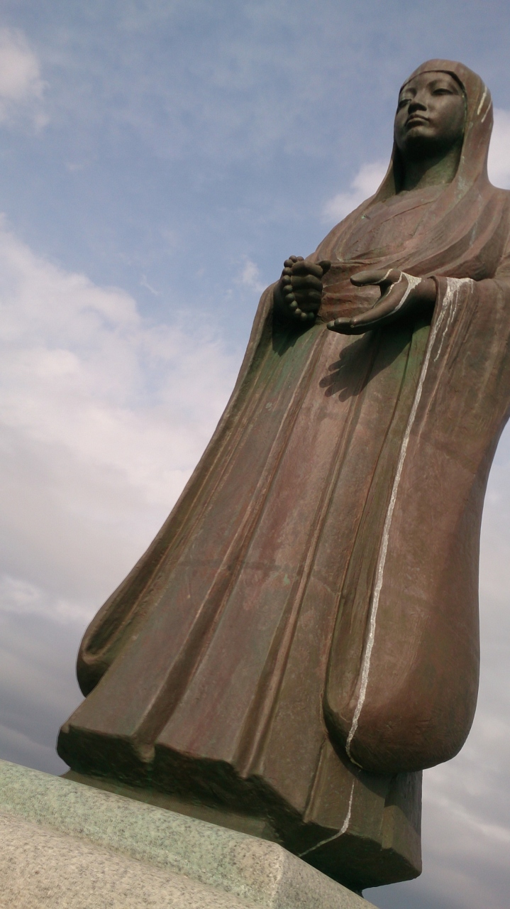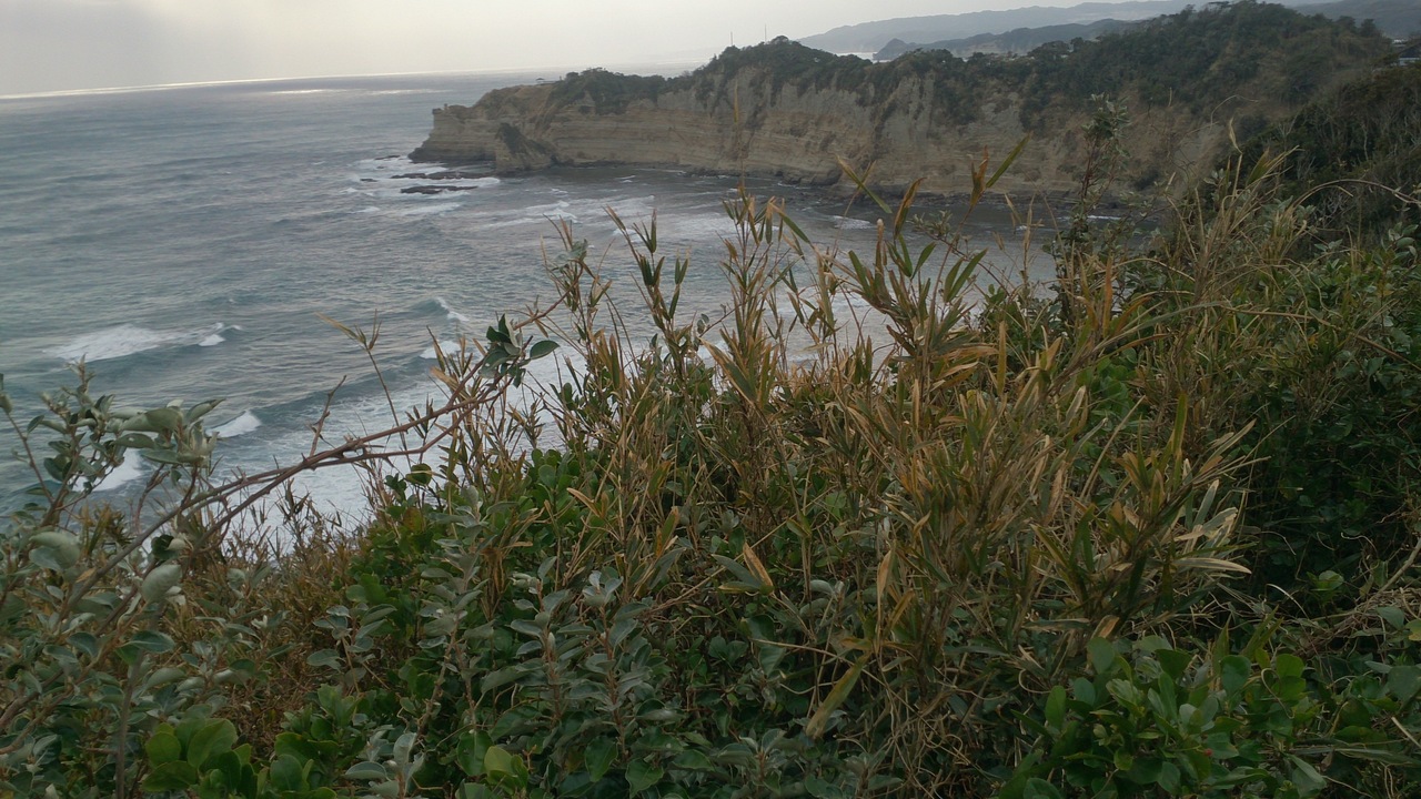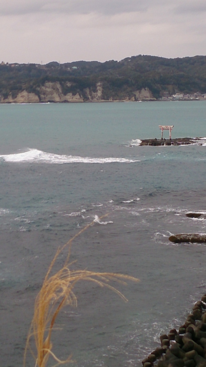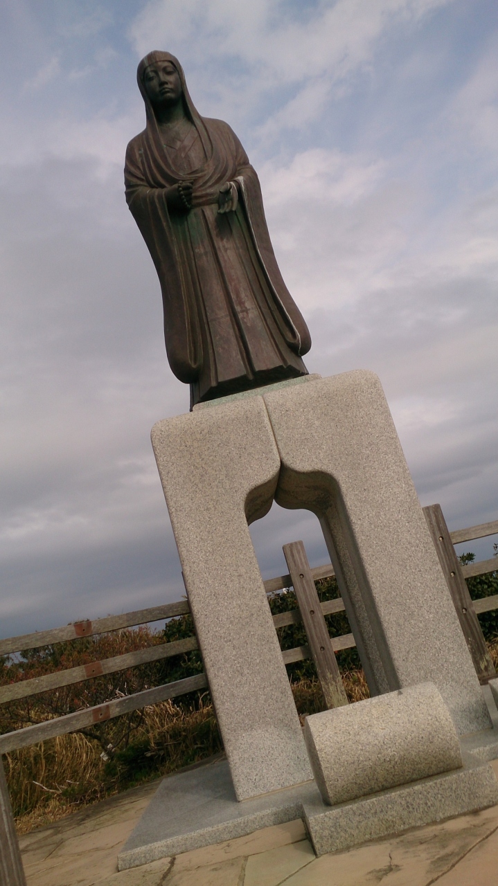 勝浦駅前の観光センターで地図をいただき、勝浦城方面を散策する。港を抜けて、坂道を上って行くと駐車場があり、さらに上ると広場横に鳥居があり、石段が続いている。勝浦城跡には神社があり、裏手を上ると絶景、海からの攻撃に対する守りに最適だったのだろう。鳥居まで下りて、更に半島の先端に行くと城主の娘おまんの方、家康の側室が迎えてくれた。