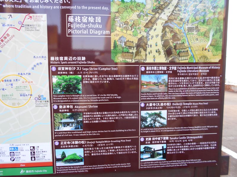 藤枝市観光協会の立派な案内板に「名所旧跡が点在しています」と案内されています。他の宿場と同じように本陣跡、宿場の入口に建てられていた常夜燈などがあります。