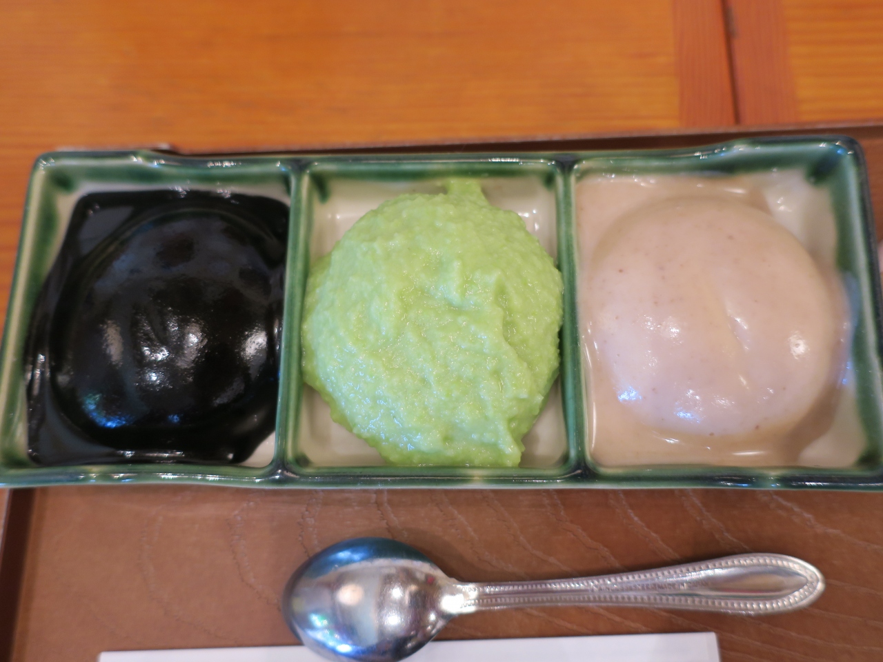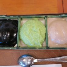 私は、くるみ・ごま・ずんだの3つの餅を味わえる