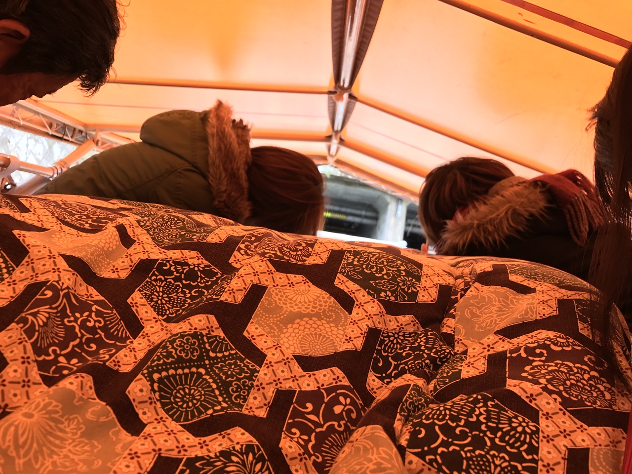 定員10名の船に乗ってめぐる45分の旅ですが、寒い時期の〝コタツ船〟がやはりオススメです。足元はコタツで暖かいのですが、上はそれなりに寒いというアンマッチがなんとも言えません。また高さや幅に制限があるため、船の屋根が下がります。情報で知っていても、実際に経験すると老いも若きもキャーキャー言って楽しんでいました。