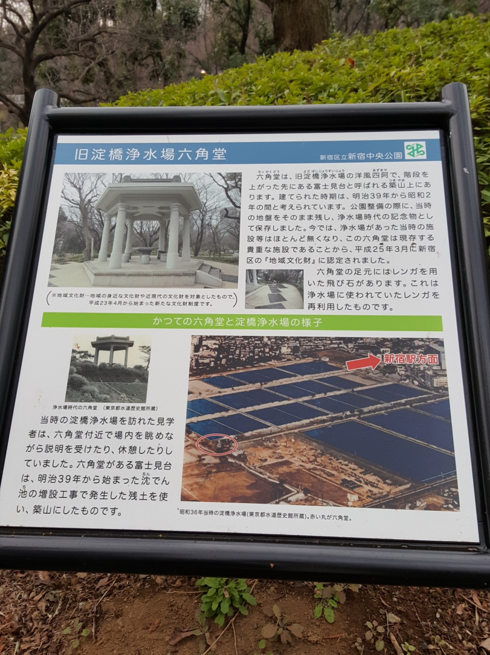 現在は緑の多い公園になっていますが昔、明治~昭和40年までは浄水場があったそうでその見晴らし台としてこの六角堂(洋風東屋)が作られたそうです。