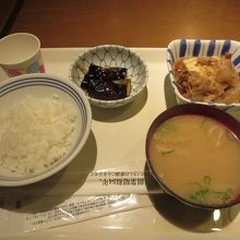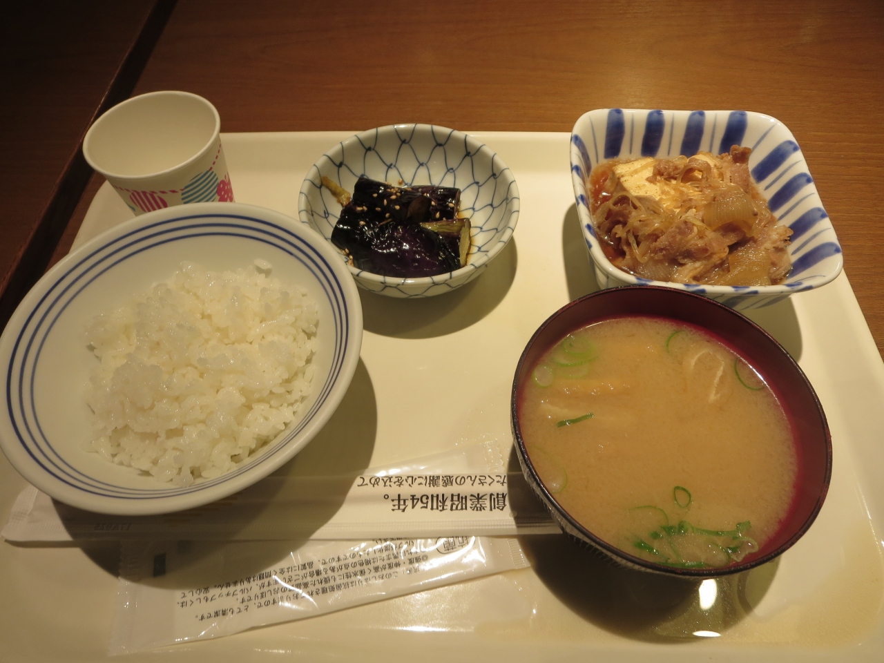 ご飯、お味噌汁、ナスの揚げ浸し、牛すき煮の4品で、700円ちょっとでした。