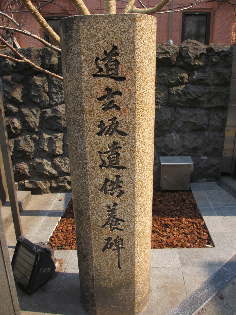 JR渋谷駅から道玄坂を上がり、渋谷マークシティの入口に、与謝野晶子歌碑と共に立っています。戦国時代にこの地に庵を構えていた道玄から名前を取ったと言われています。江戸時代には神奈川からの物資を江戸に運ぶ重要な道であったり、明治時代には芥川龍之介の通学路だったり、林芙美子が夜店を出店したりと、歴史ある坂道です。今は若者文化の中心としての役割を果たしています。この先、道玄坂を中心に、街はどう変わっていくのか見守っていきたいです。