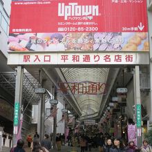熱海駅をロータリー側に出て右手に進んだ所に2つ並んであるアーケード商店街の右側の法です。仲見世通り商店街より平和通り商店街の方が2倍程の長さがあり、飲食店や商店が多いです。干物店や、土産物点などではその場で食べられるもの売られており、ベンチも用意されているので、食べ歩きが楽しい商店街です。