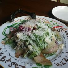 この日いただいたのはサラダ、ピザマルゲリータ、海老のクリームパスタ。
