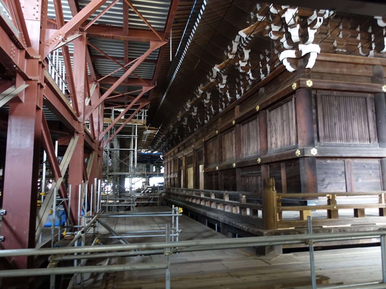 「大殿」の別名を持つ「御影堂」ですが、残念ながら修復工事中で、その全景を見ることは出来ませんでした。しかしながら、阿弥陀堂から廊下を渡って近づく際に、足場が組まれた状態ですが、外観の一部を見ることが出来ました。
