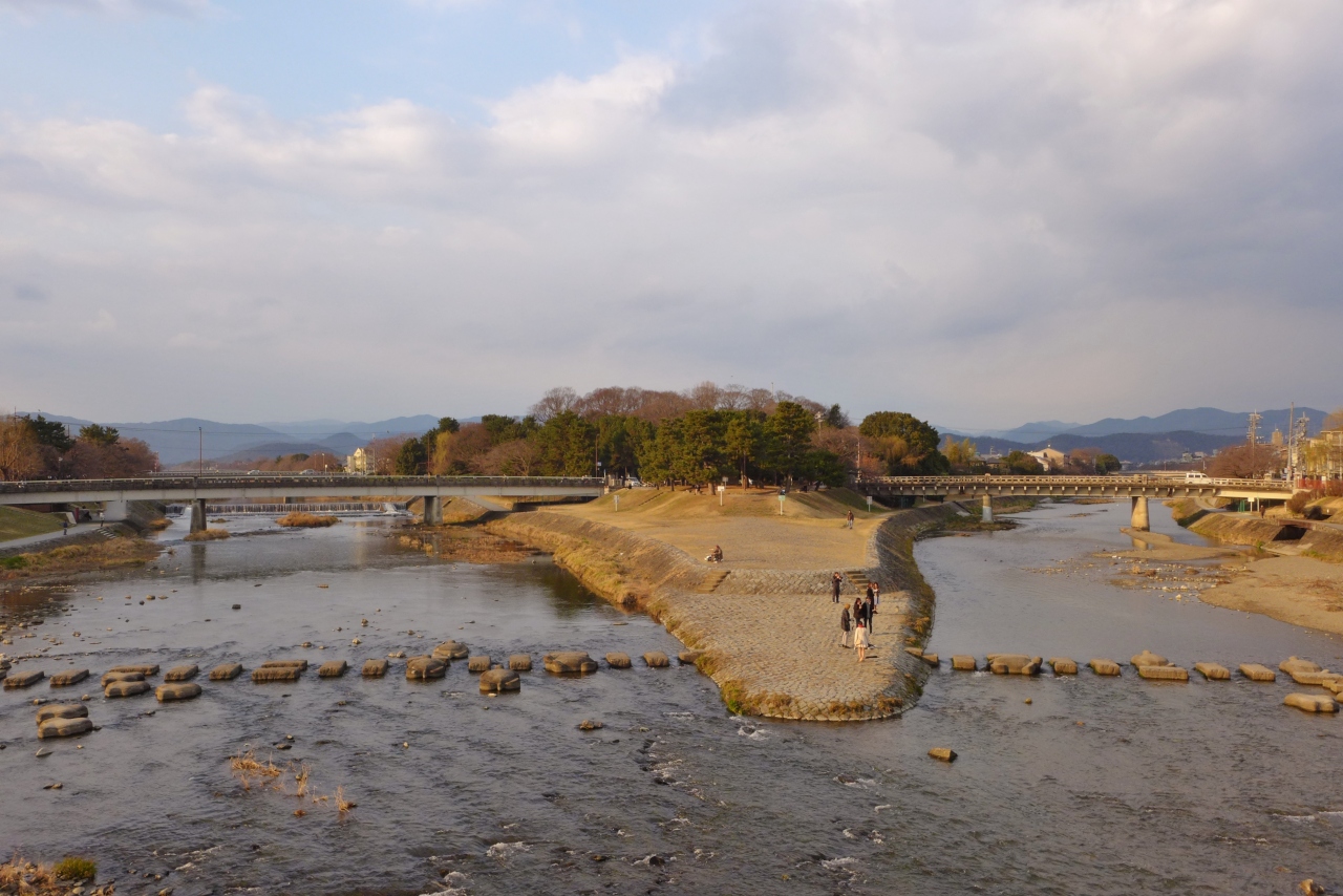 橋からは合流する二本の川と中央に下鴨神社の緑を遠くには京都の町を取り囲む山々を見ることができました。河原を散策する人も大勢いました。この辺りには高いビルも少なく眺めが良いのでお薦めです。