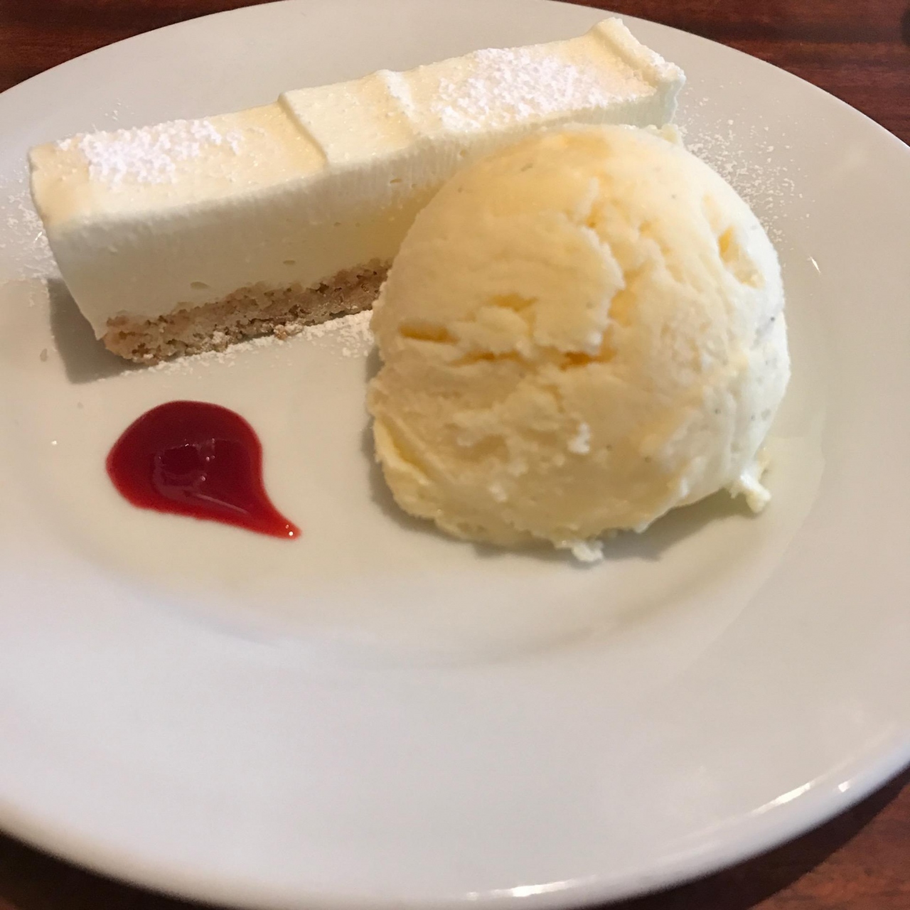 友人に予約してもらって日曜のランチへ。2300円の一種ですが、前菜とメイン料理が選べます。前菜はカツオ、メインはお肉にしましたが大当たりのおいしさ。そしてデザートのレアチーズタルトとバニラシャーベットが最高においしかった。