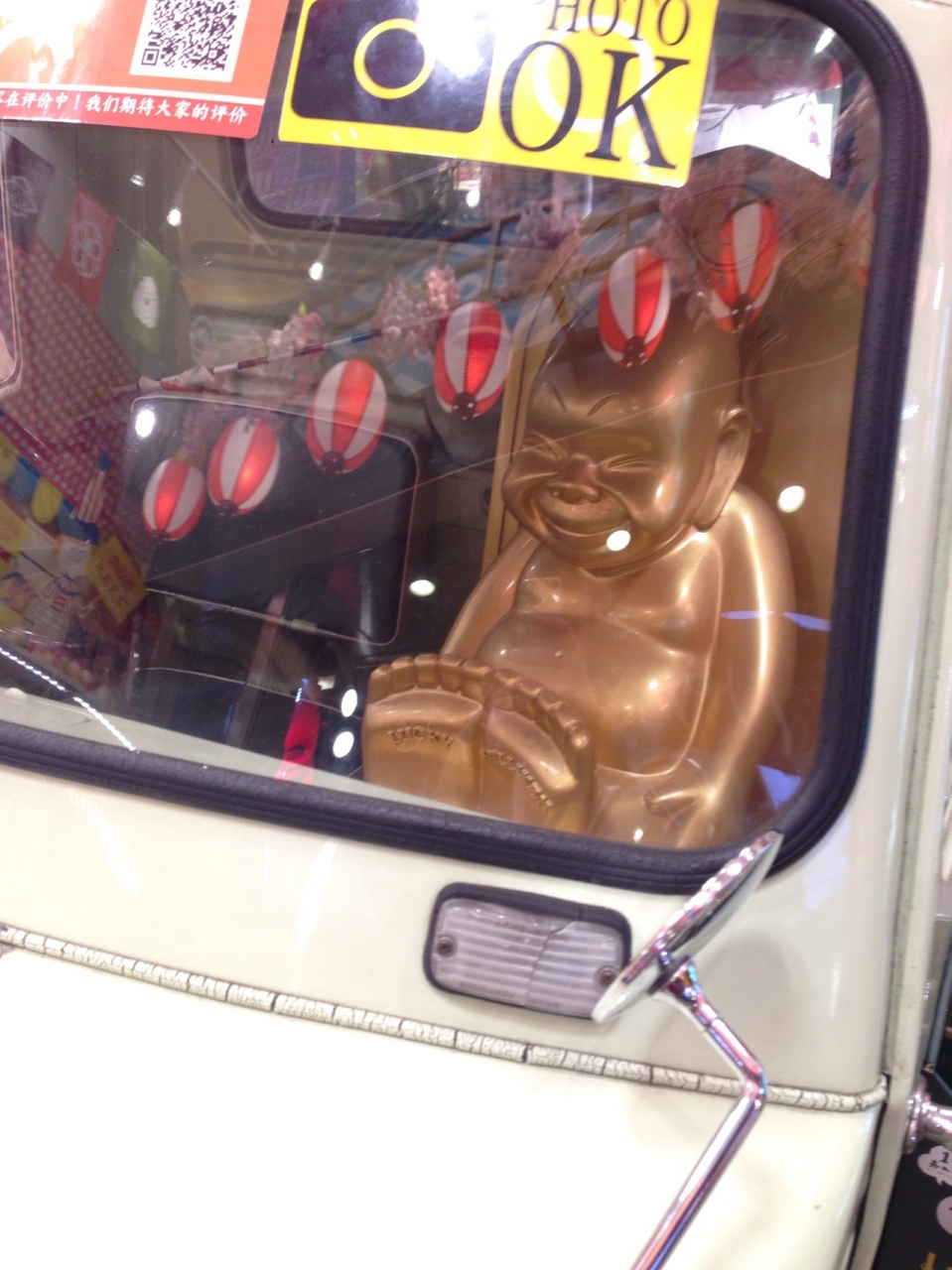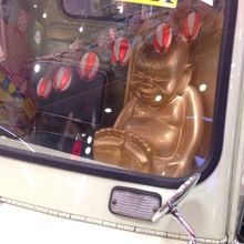 店内に置かれたレトロな自動車の運転席にビリケンさんがいるディスプレイ、記念撮影にもお勧めです。