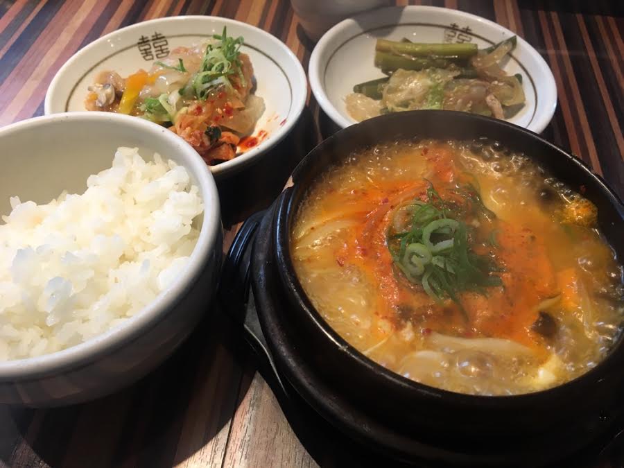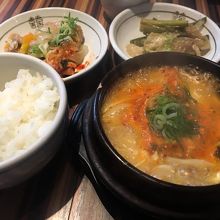 スンドゥブちげセットを頂きました。辛すぎてもどうかなと思ったので、少しマイルドにしてもらいましたが、マイルドすぎでしたので、少々でも辛いのが大丈夫な方はそのままのほうがいいと思います。