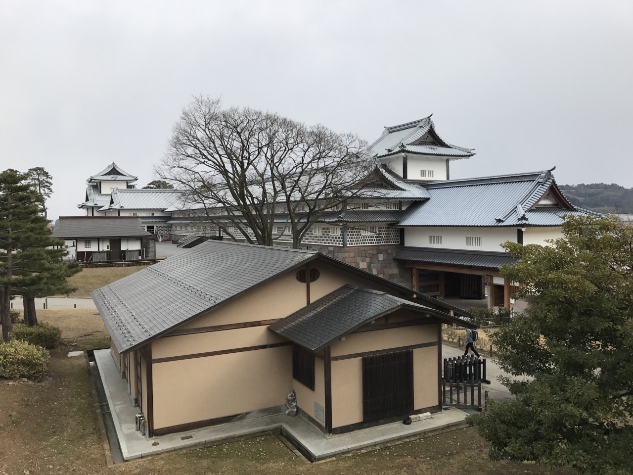 金沢城の二の丸と三の丸の間にある広場で、橋爪門や五十間長屋などが見渡せて、個人的には金沢城のビュースポットだと思います。天守がない分、横に長い白い建物と立派な門はまさに金沢城の象徴でしょう。今は休憩所が工事中なので、一部規制されています。