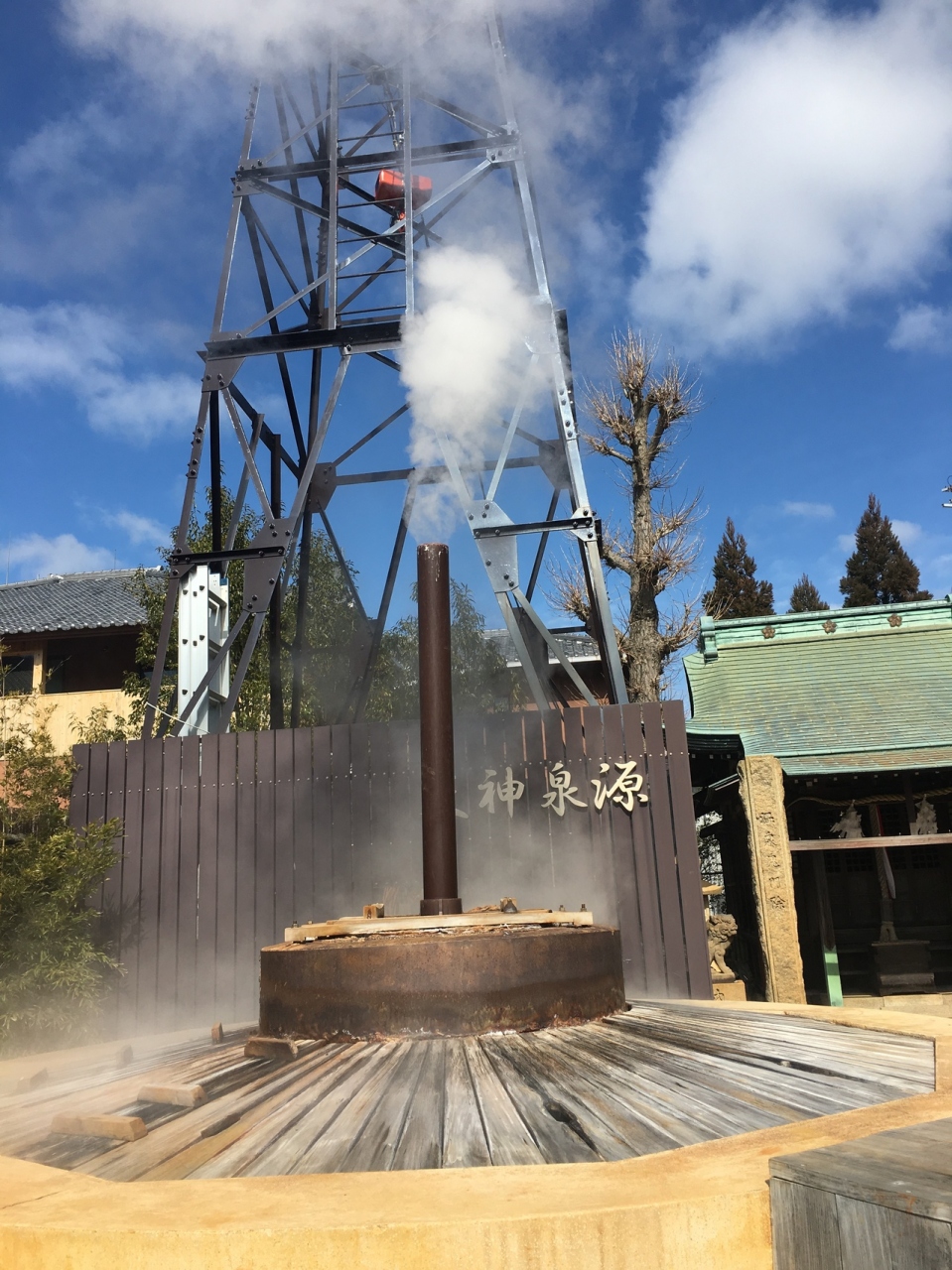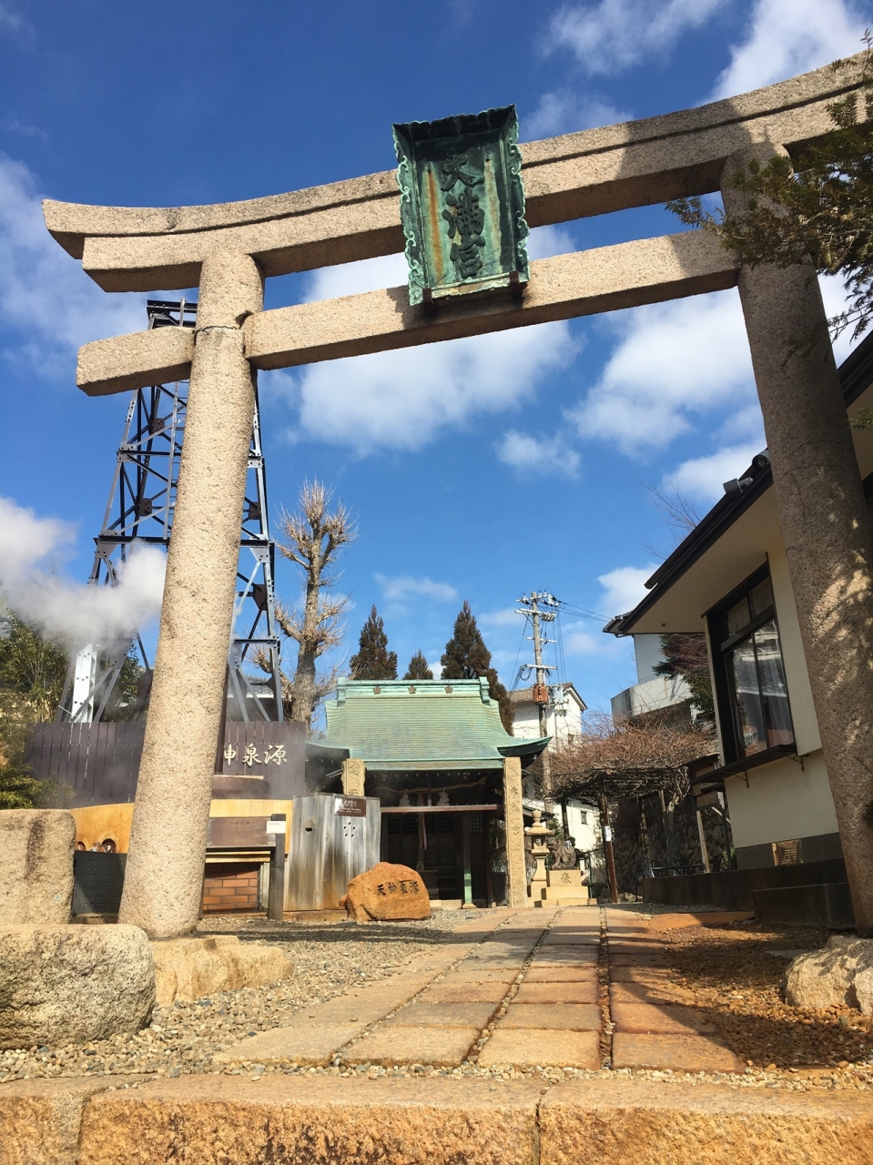 なるほど、神社の境内に源泉が。しかも湯煙もくもく、活動中!参道の石畳や近くの路地が金泉のような赤みを帯びて、なにやら神々しい雰囲気です。