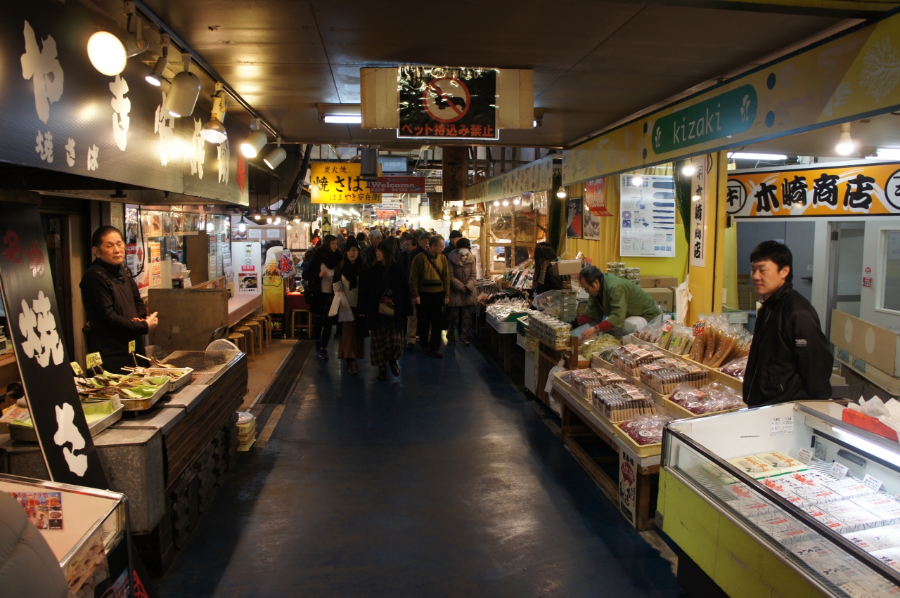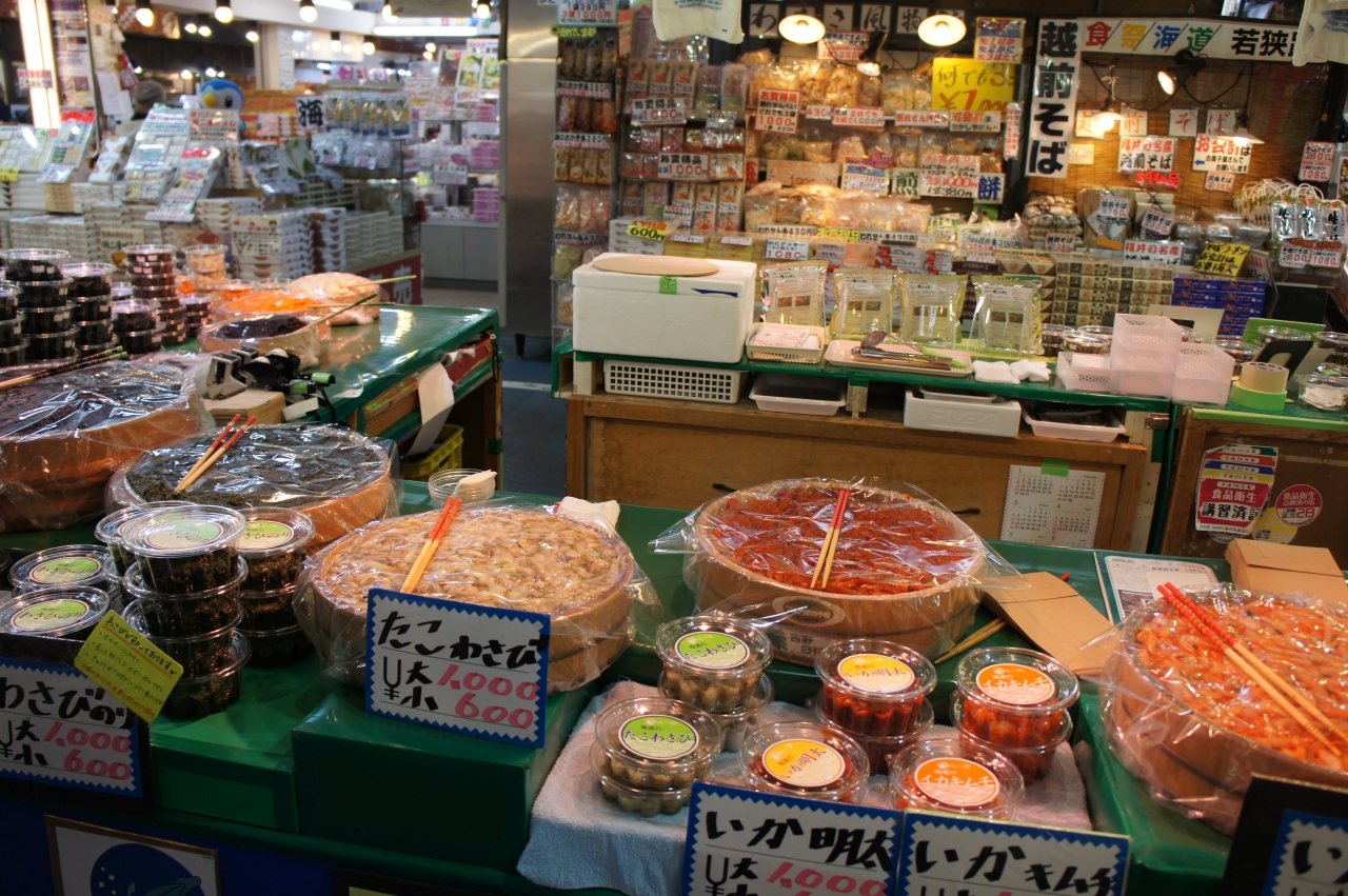 若狭方面へのバスツアーの最後の目的地であるこのさかな市場に立ち寄りました。日本海に近いということもあり、新鮮な魚貝類が広いスペースで売られています。店がいっぱい入っていて、店員さんの元気な呼び込みがあちこちの店から聞こえてきます。新鮮さが売りだから、こういうかけ声でなきゃ駄目です。バスツアーのプレゼントがもらえるお店に入ると、鯖寿司が何と半額で売っていました。事情を聞くと、山陰地方からのツアーバスがこの雪で道路閉鎖になり来られなくなったというこです。数を見込んで仕入れているから売れ残っては捨てるだけとか。商売も大変です。海産物をお値打ちに買うならこのさかな街にぜひ立ち寄ることをお勧めします。