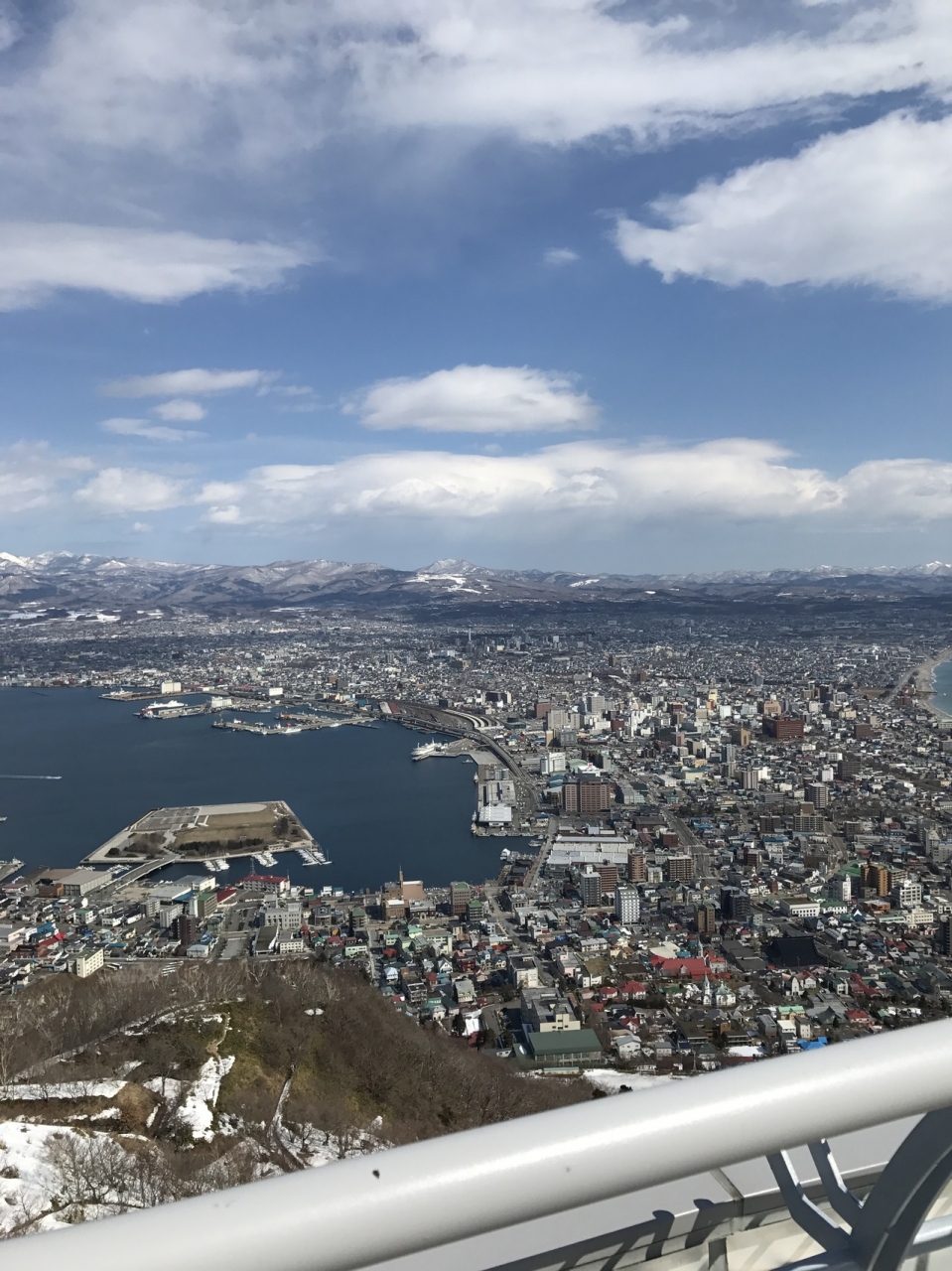 函館ロープウエイで頂上まで登ると函館山に到着します。函館湾と津軽海峡の両方の景色が一望出来る観光スポットで、函館に来た際には函館山からの景色を是非とも観る価値はあります。三月後半でも山頂はまだ雪が残っています。