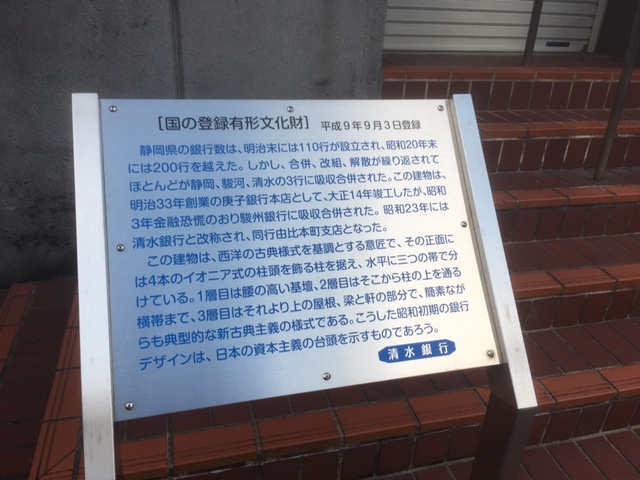 ギリシア建築には、三つの主要な建築様式があります。ドーリア式、イオニア式、コリント式の三つですが、この清水銀行由比支店はイオニア式が採用されており、それは柱のデサインに見てとることができます。このような威風堂々とした建築が、昔の面影を残すこの旧東海道沿いにあるとは驚きです。大正期の銀行を象徴する貴重な建造物なので、由比に行かれた際にはぜひ足を運んでみてください。
