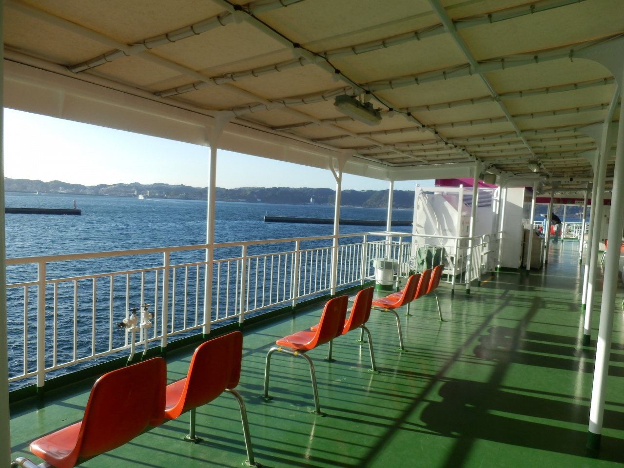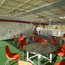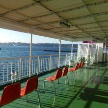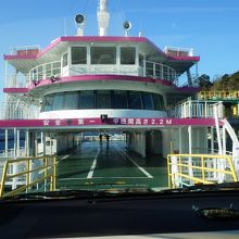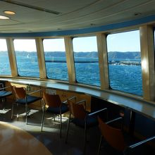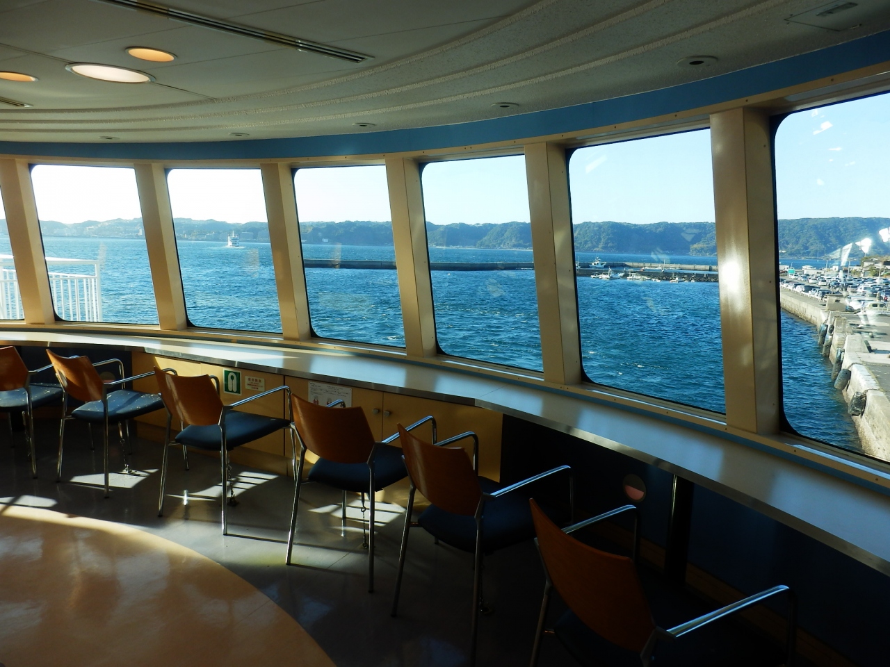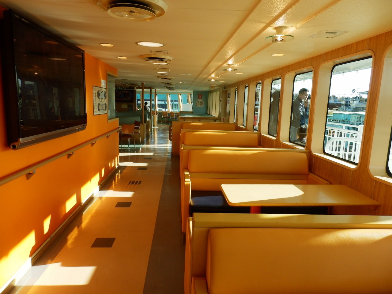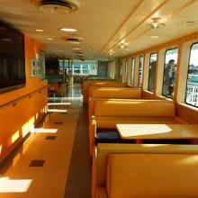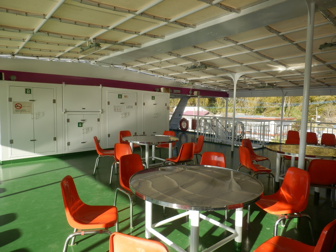 車のまま乗りこむと、係の人が誘導してくれて、タイヤには車止めが置かれました。フェリー内に駐車した後、テーブルと椅子が並べられた船内に入ってみましたが、展望レストランのような雰囲気で、ゆったり寛げて良かったです。