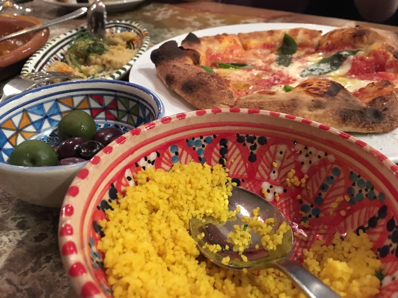 4人でオリーブ、ひよこ豆のペースト、野菜のクスクス、マルゲリータ、ゴルゴンゾーラのピザを注文。「クスクスが有るってことはモロッコ料理の店?」「いや、でも、マルゲリータあるし」「無国籍、だね」ワイワイと食べながら上映までの時間をグダグダと待つ。こんな待ち時間もありだな、と思わせてくれた。
