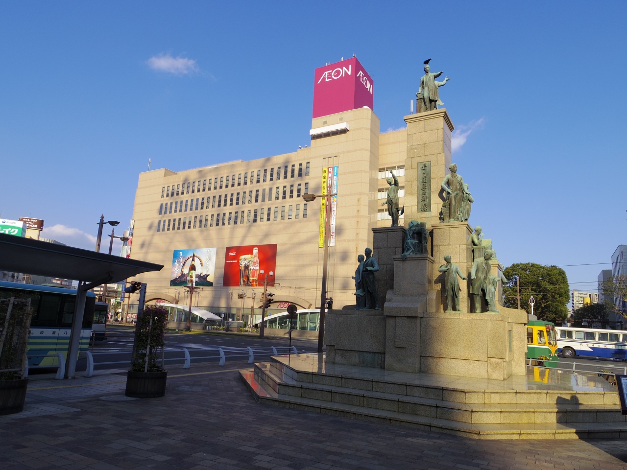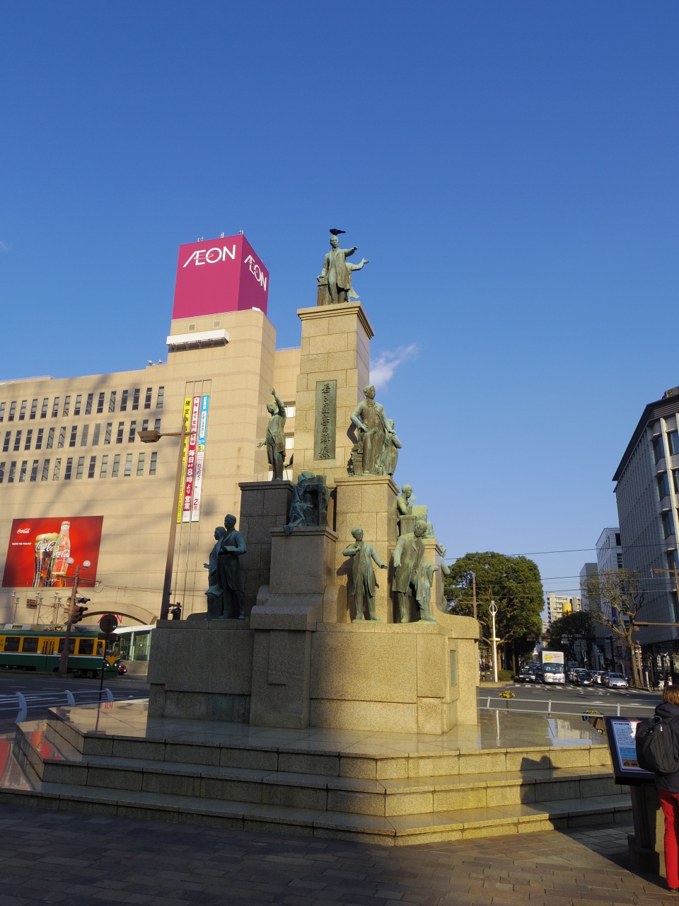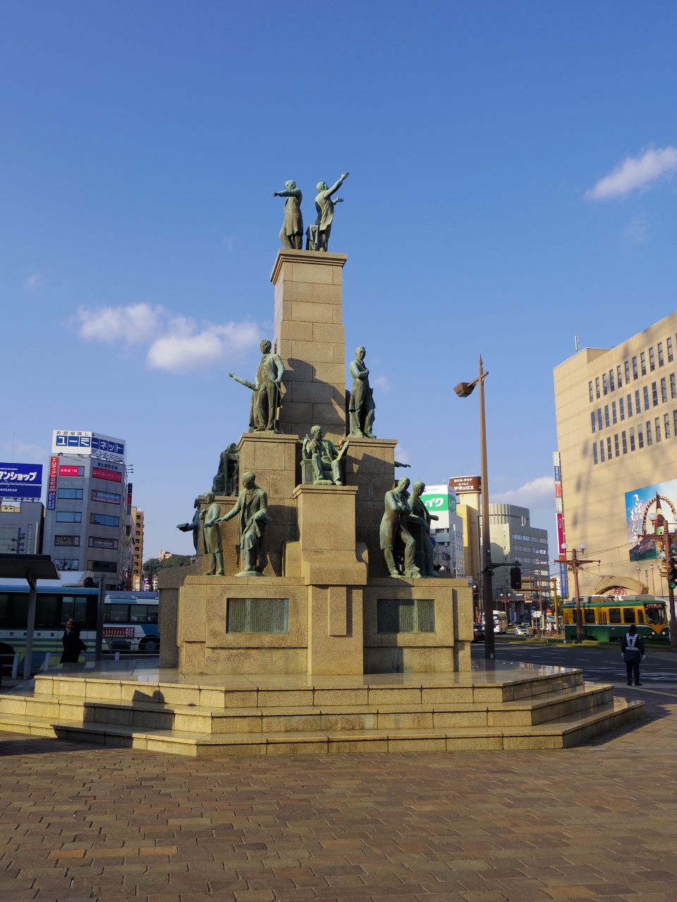 鹿児島中央駅から市電の停留所に向かうと、いろいろな姿勢をした銅像が取りつけられた記念碑がそびえ立っていて、近づいてみると、慶応元年(1865)に薩摩藩が英国へ派遣した留学生たちとのことでした。