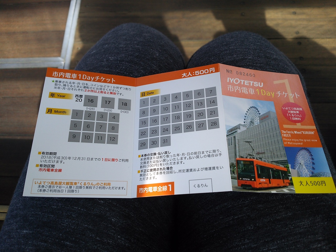 今回の観光で市内電車に相当な回数乗りました。1日乗車券です。1回だけ大観覧車のに無料で乗ることもできます。市内電車は頻繁に運行してます。待ち時間はあまりありませんが、道後温泉からJR松山駅に行く系統が少ないので注意です。2日券はさらにお得です。