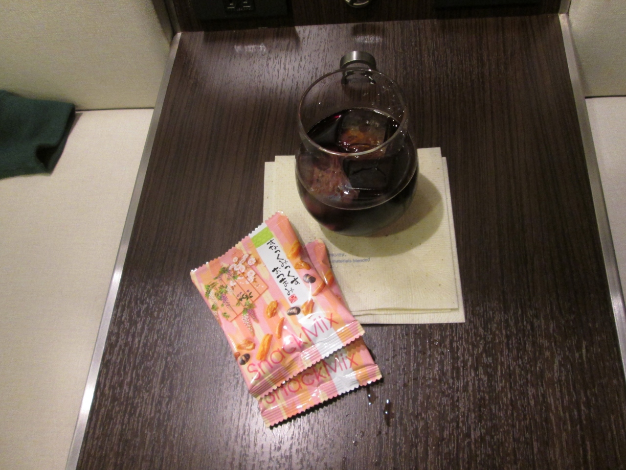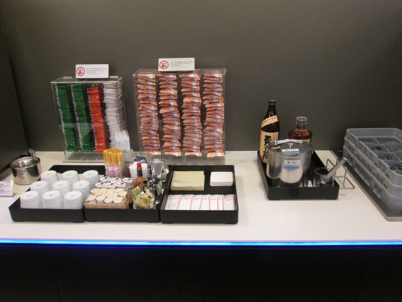 関西空港国内線のANAラウンジにはフードメニューがなく、おつまみとして、柿ピーが置いてあるだけでした。食事をしたいときは、ラウンジに入る前にターミナル内のコンビニ、売店で購入してきた軽食を持ち込んでというスタイルになりました。ラウンジは再入場できるので、少しお腹が空いたときもそうしている人がいました。