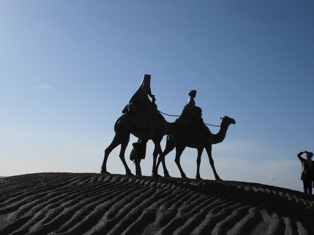 バス津阿0-出立ち寄りました。以前テレビで見た事があって行ってみたいと思っていた所でした。朝の砂浜にらくだに乗った像を見ると本当に対の砂漠の詩の通りでした。