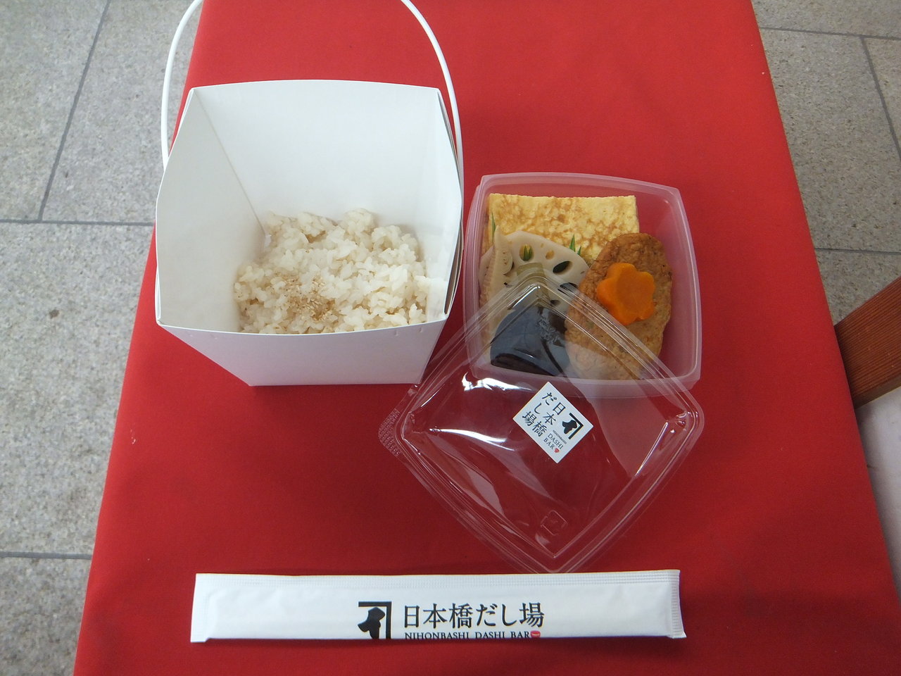 ☆炊きたてのご飯の上におかずの容器が載るため、おかずの容器の下に蒸気の水滴が付いていました。少し手が濡れますので注意しましょう。お手拭きをくださいます。