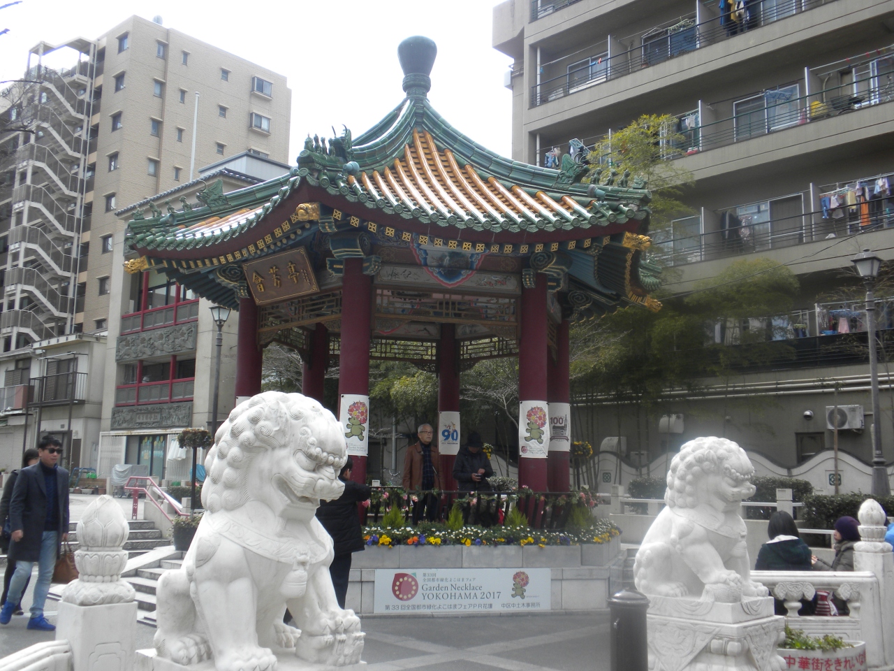 花で覆われた四阿屋「會芳亭」の中にはベンチもあり、中華街を訪れた観光客が寛いでいました。