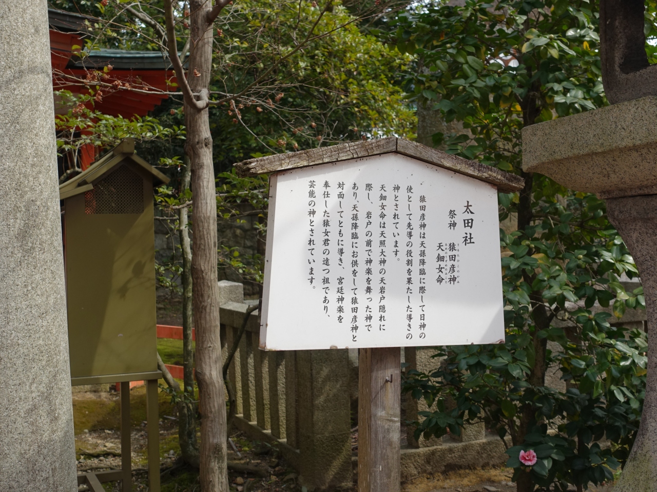 京都を今回訪ねて、人が一番多かったのが、八坂神社でした。団体の観光客、待ち合わせの人など、交差点に面している西楼門前から、中に入ると、本殿の手前に、いくつかの摂社があります。その中の一つがこの太田社です。鳥居の横の説明書きを読むと、芸能の神様でもあると記されていました。