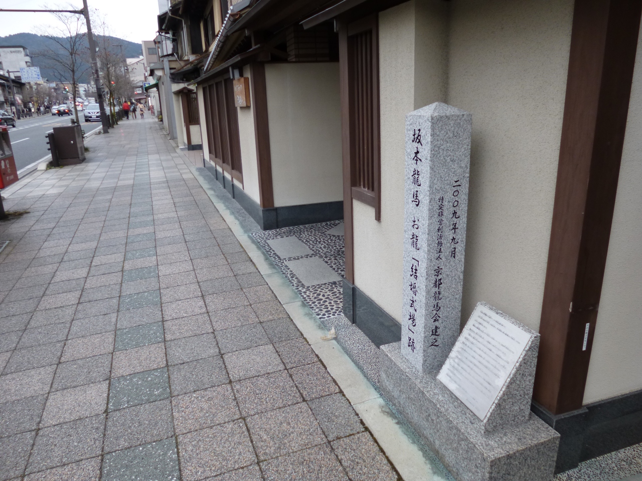 今なお人気の衰えぬ幕末の志士ゆえに、最近設置されたのだと思います。石碑近辺の三条通の光景もとても風情を感じます。