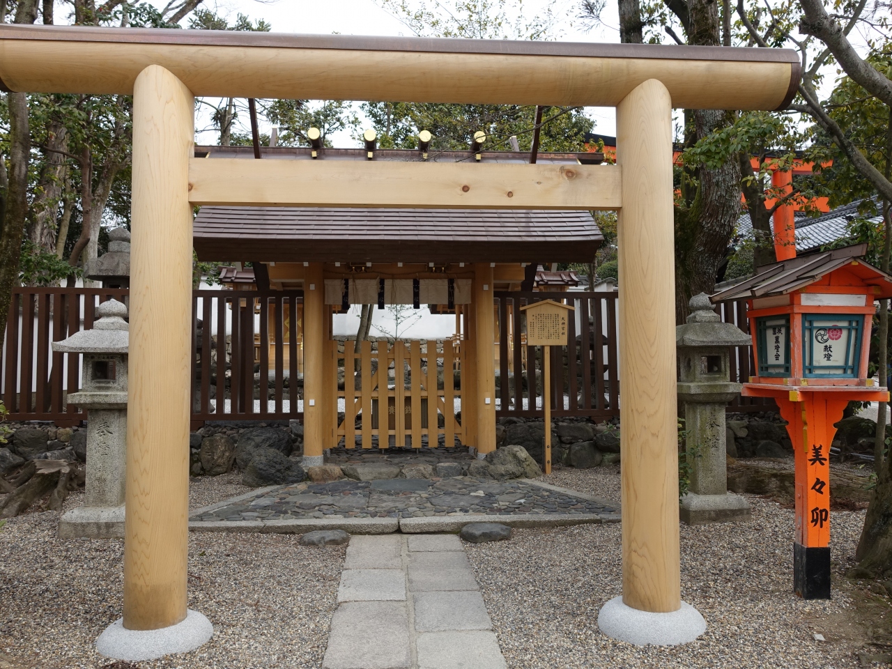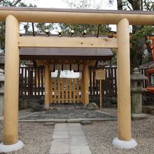 八坂神社から円山公園に通り抜ける場所に、この末社があります。天照大神と豊受大神が祀られていることからも、重要な末社であると思われます。真新しい、白木の鳥居が朱色の多い、八坂神社の境内の中では、新鮮に目に映ります。