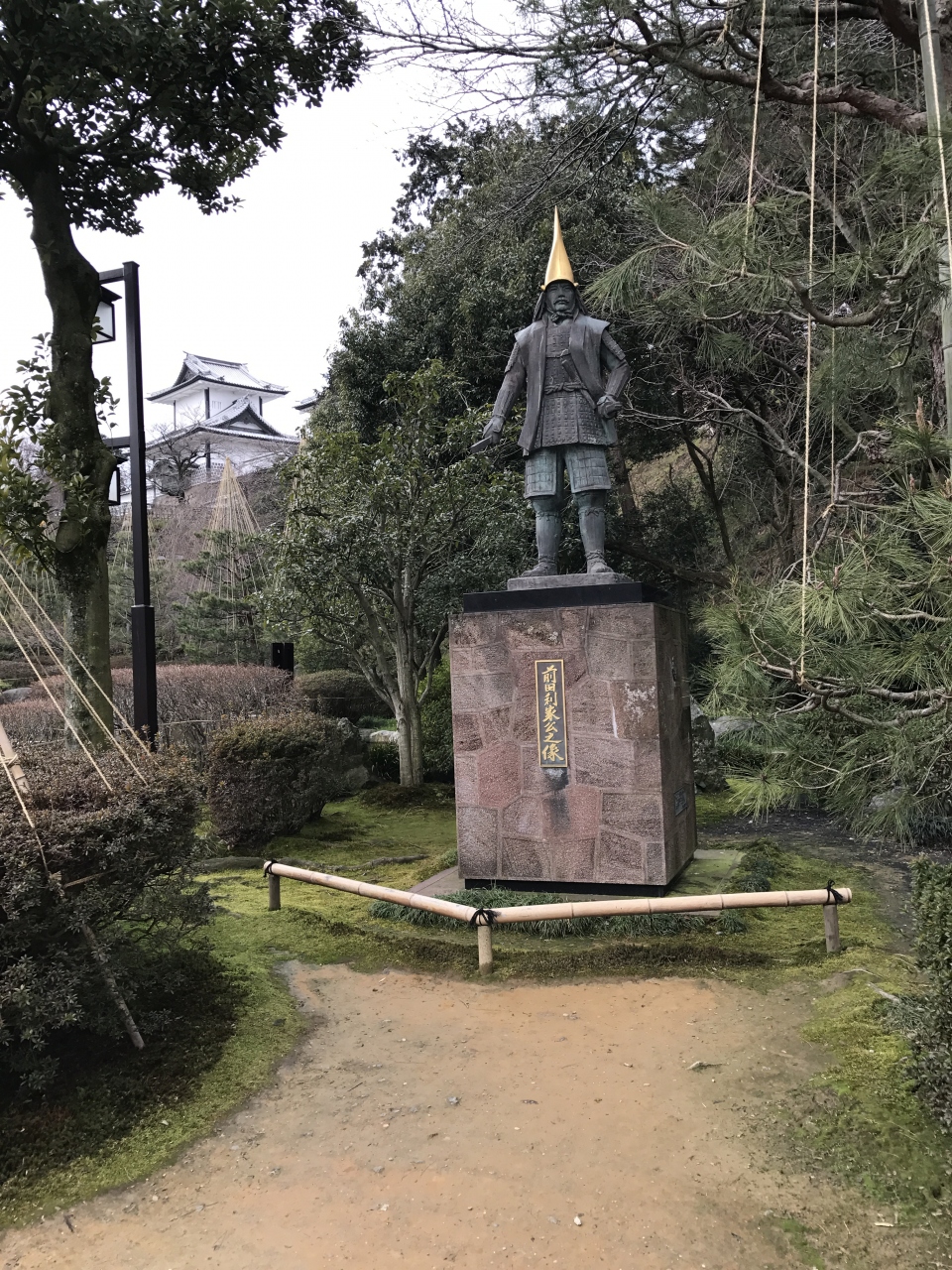 金沢城の石川門の真下、兼六園の入口付近に勇ましく利家の銅像が建っていました。金のかぶとをしていたのがちょっと面白かったですが。ここだけ多くの人が集まって写真などを撮っているので、すぐ場所はわかるかと思います。
