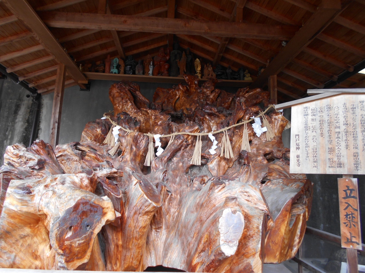 高野山奥の院、弘法大師御廟近くの参道に高さ60m、樹齢800年の老杉があった。生命を全うした杉根をいただいたそうです。延命・病気平癒(全快)のご利益があります。