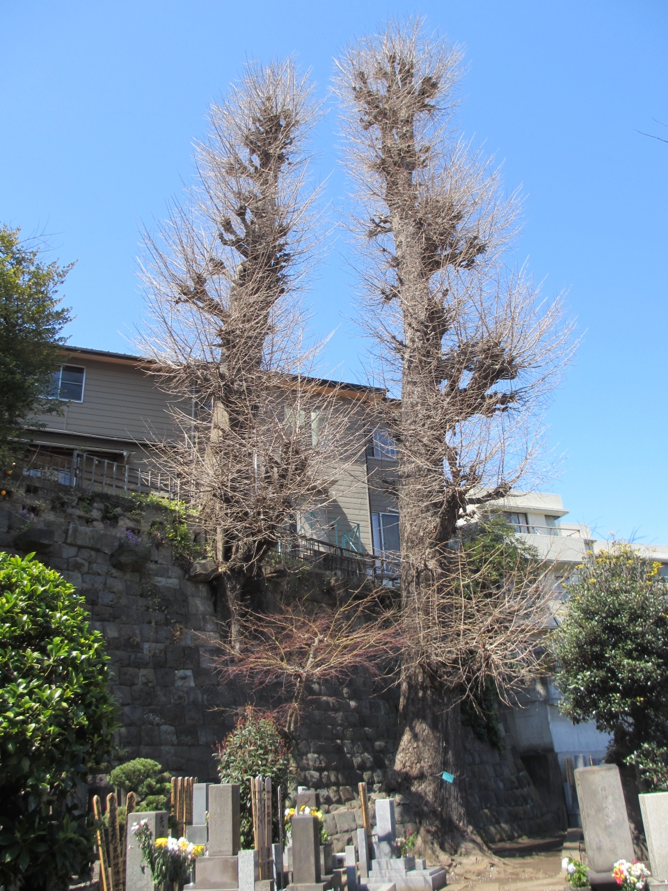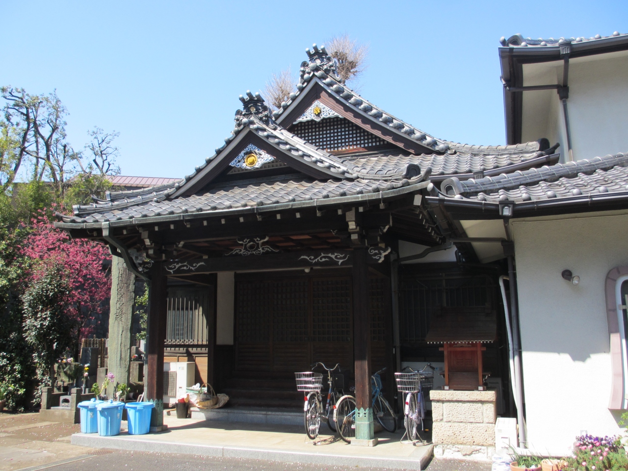 江戸時代、江戸城域拡張のため現在地に移った日蓮宗寺院です。戦災で本堂などが焼失し、木造の本堂が建てられました。塀はレンガ色のタイル張りで寺の塀としては珍しく一般住宅のような印象を受けます。本堂を囲むように墓地があり、裏の須賀神社境内との高低差のある石垣に歴史を感じます。イチョウの大木があり、1本は崖から生えています。満開を過ぎた梅と寒緋桜が咲いていました。墓地にある年代が古そうな石塔に興味を持ちました。いつの時代のものか記されていないのが残念です。須賀神社の有名な石段とは別の拝殿横の階段の下にあるので寄ることをおすすめします。