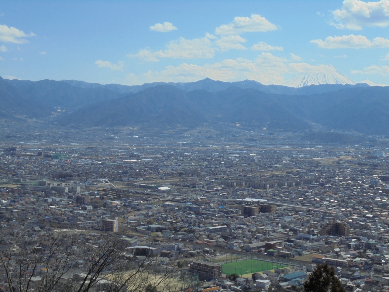 甲府の中心からはそれほど遠くない場所にありますが、ヘアピンカーブの続く坂道を上ることになります。その分展望台からの眺望は抜群で甲府市内はもちろん富士山や南アルプスの山々を眺めることができます。山頂には県立科学館や遊具のある公園もあり、子どもがいれば一日楽しめそうなスポットです。