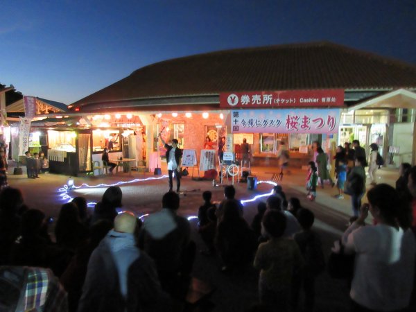 今帰仁城跡に成り行きで訪れることになり、偶然、第10回今帰仁グスク桜まつりの2日目に居合わせることになりました。今帰仁城跡は素敵にライトアップされていますが、ライトアップされた桜木には未だサクラがほんの少し咲き始めたという具合で、ちょっと残念でした。グスク交流センター前では、大道芸人の模催しも行われており、楽しめました。