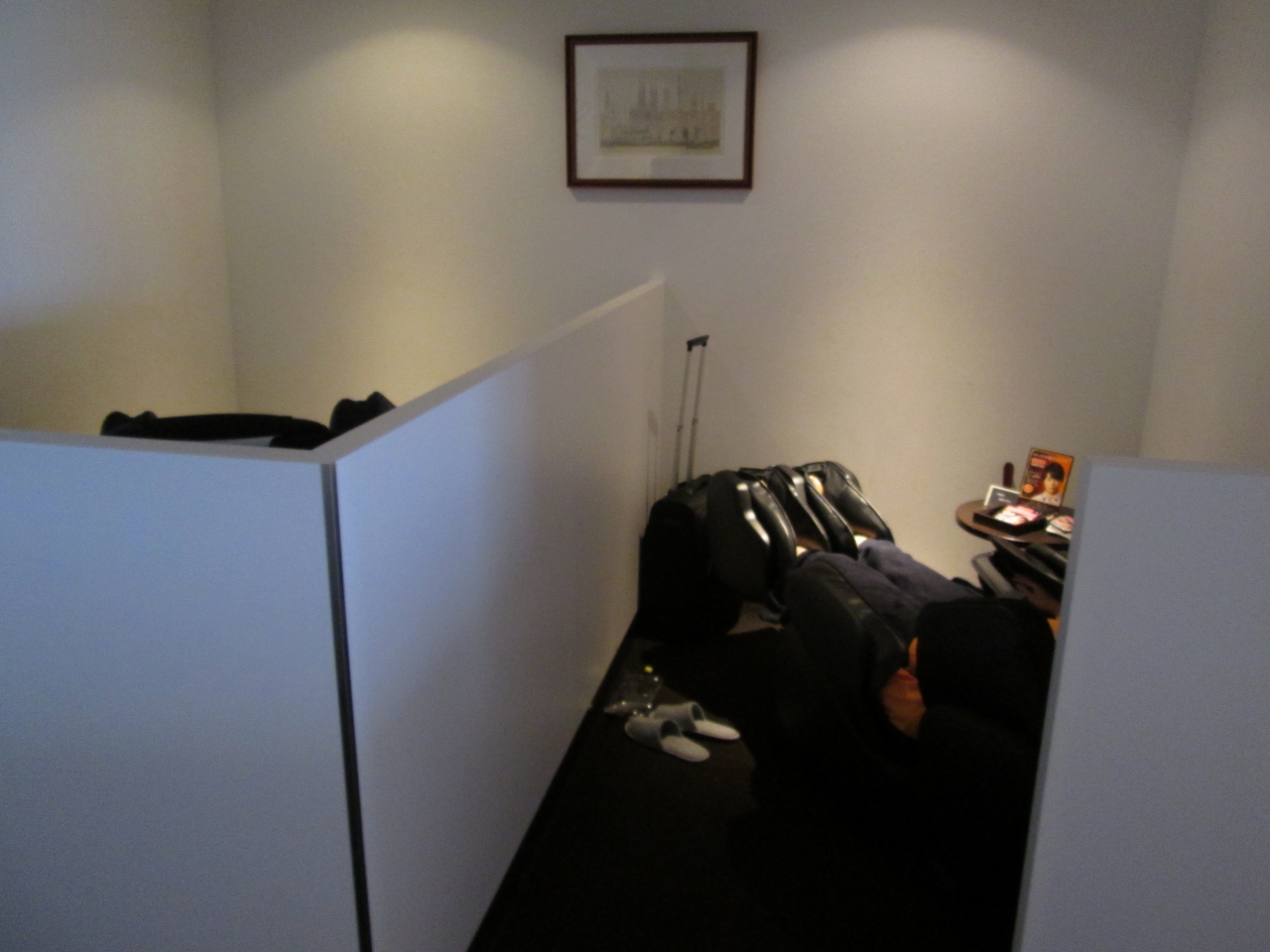 JAL国内線サクラの奥にマッサージチェアがあります。成田空港のラウンジにはマッサージ師によるマッサージですが、こちらは機械です。機械でも搭乗前にマッサージを受けると体が軽くなります。4台置いてあり1台だけ空いていました。人気のマッサーチェアでした。