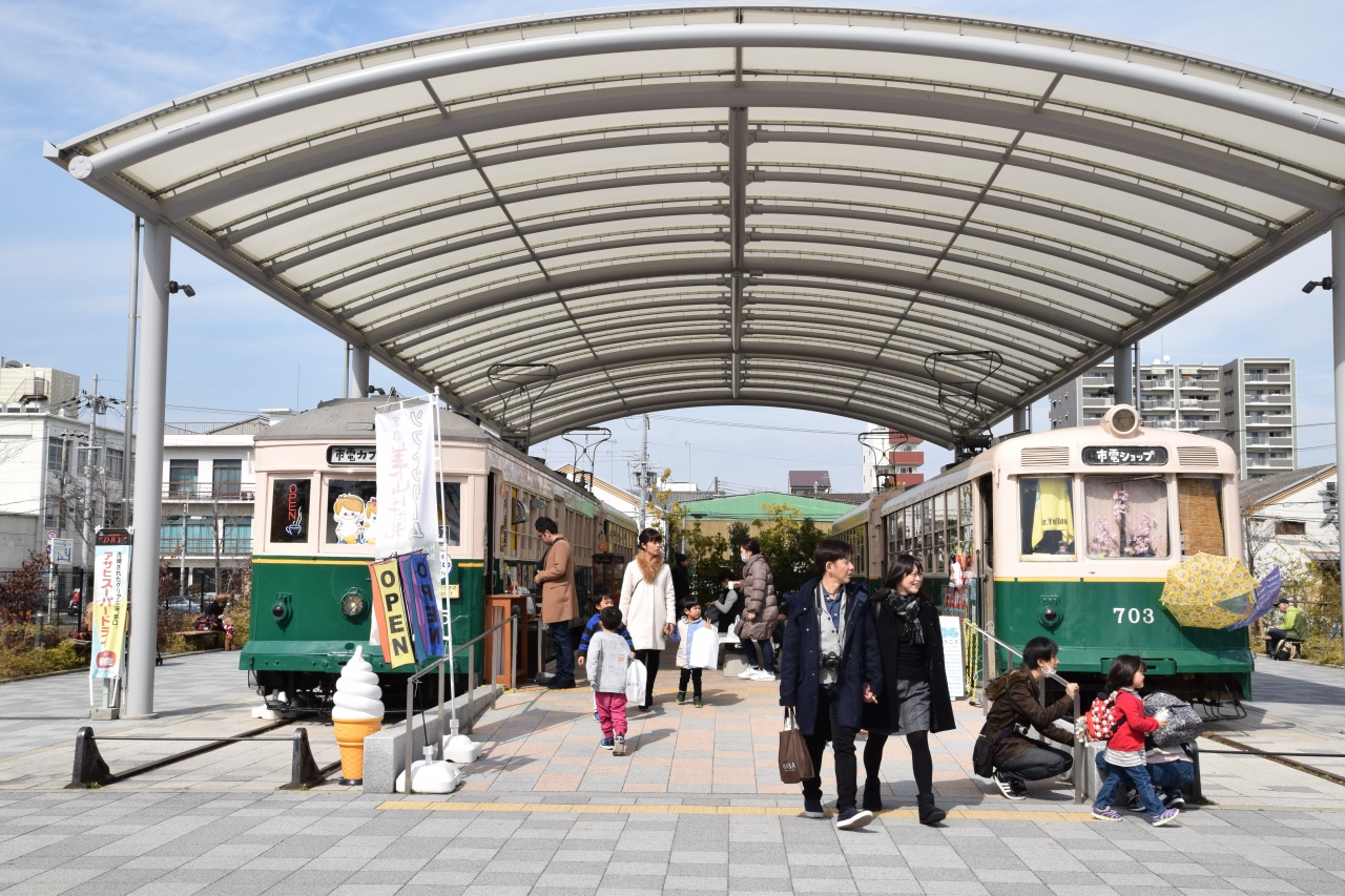梅小路公園の真ん中辺りに、並んで計4台の市電の車両が有ります。
