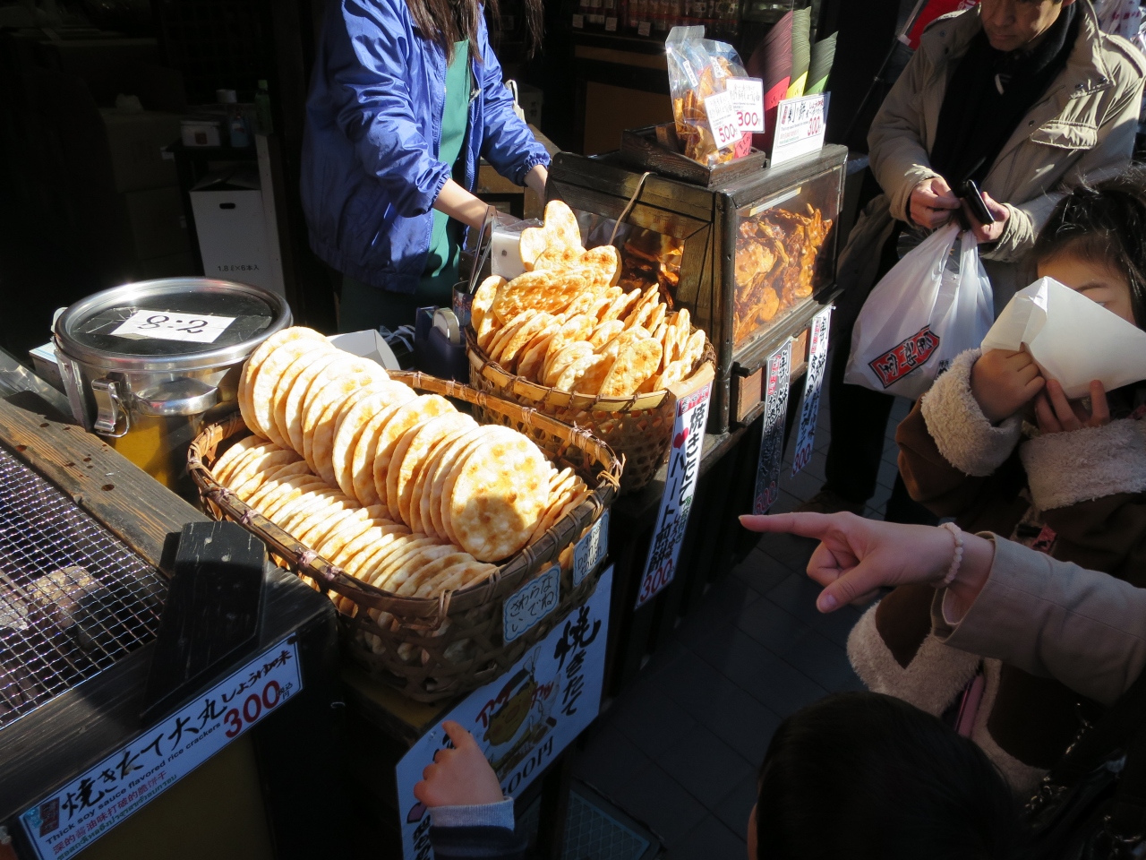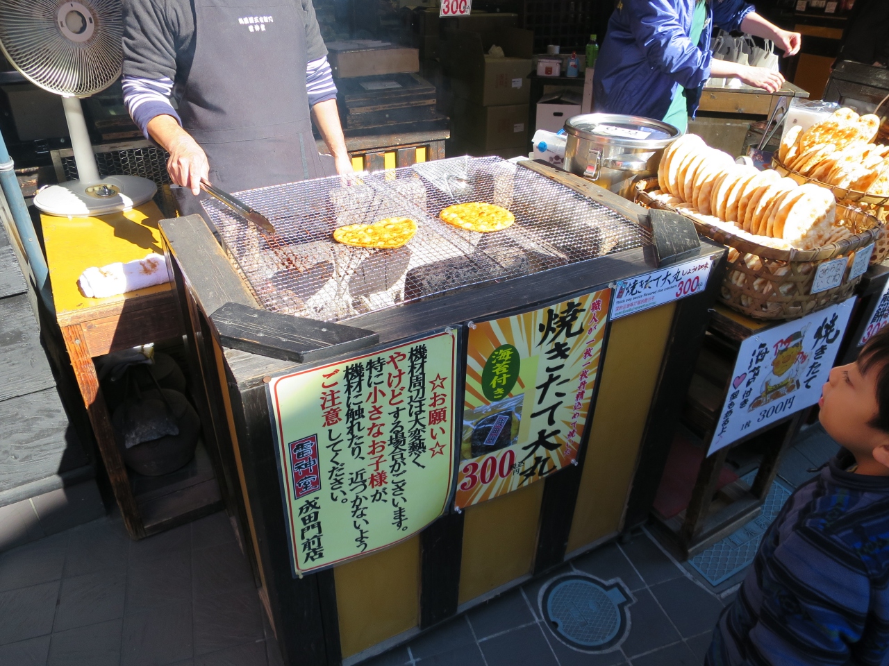 おすすめは、1枚300円の焼きたて煎餅です。その場で醤油をつけて焼いてくれますよ!