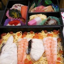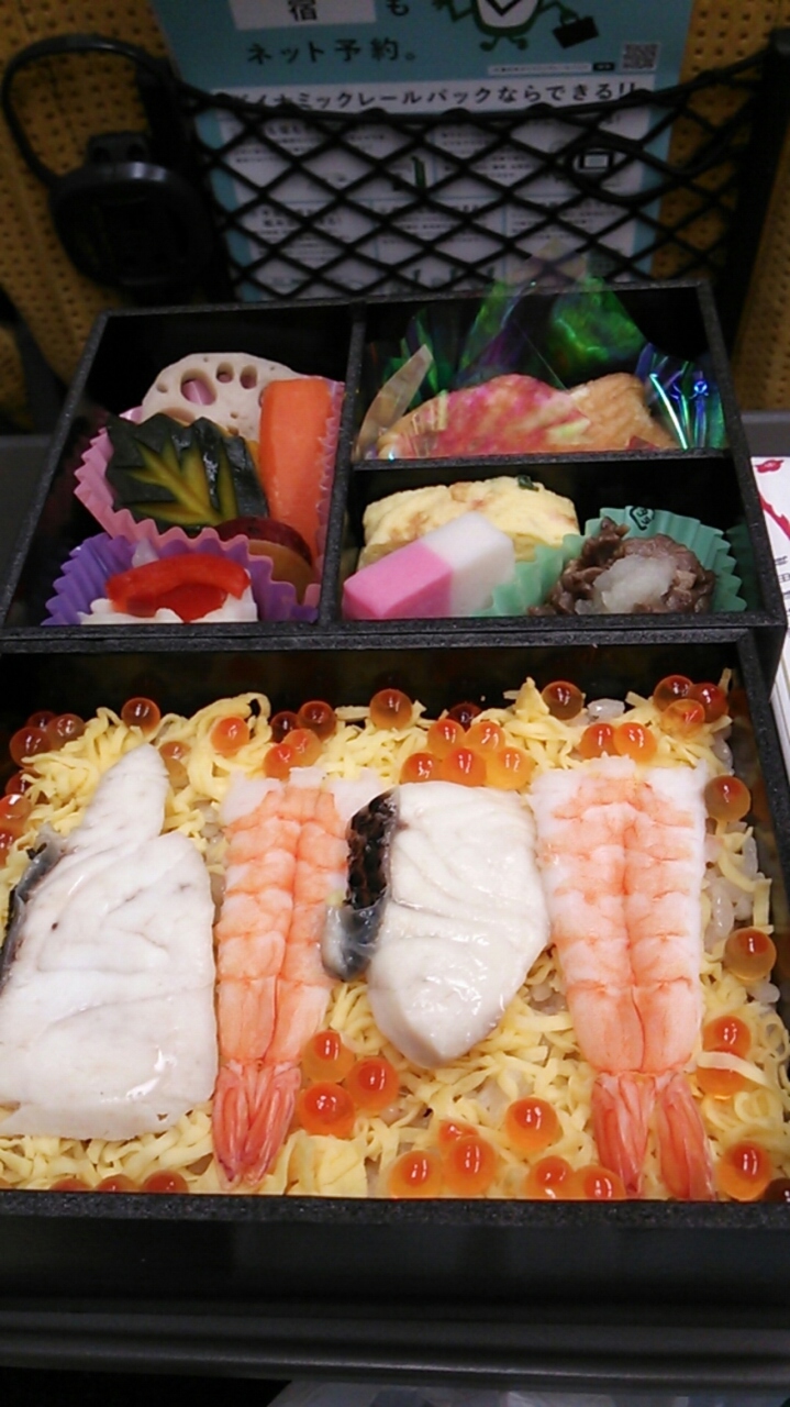 この駅弁、2017年3月で秋田新幹線「こまち」が運行を開始してから20周年を迎えたことを記念して製造・販売されたもので、1段目には真鯛・海老・いくら等が入った味付けご飯、もう1段には卵焼き・和牛焼肉大根おろしあえ・紅白かまぼこ・煮物(さつまいも・かほちゃ・蓮根等)等といったおかずの他、鯛焼きも入っていました。
