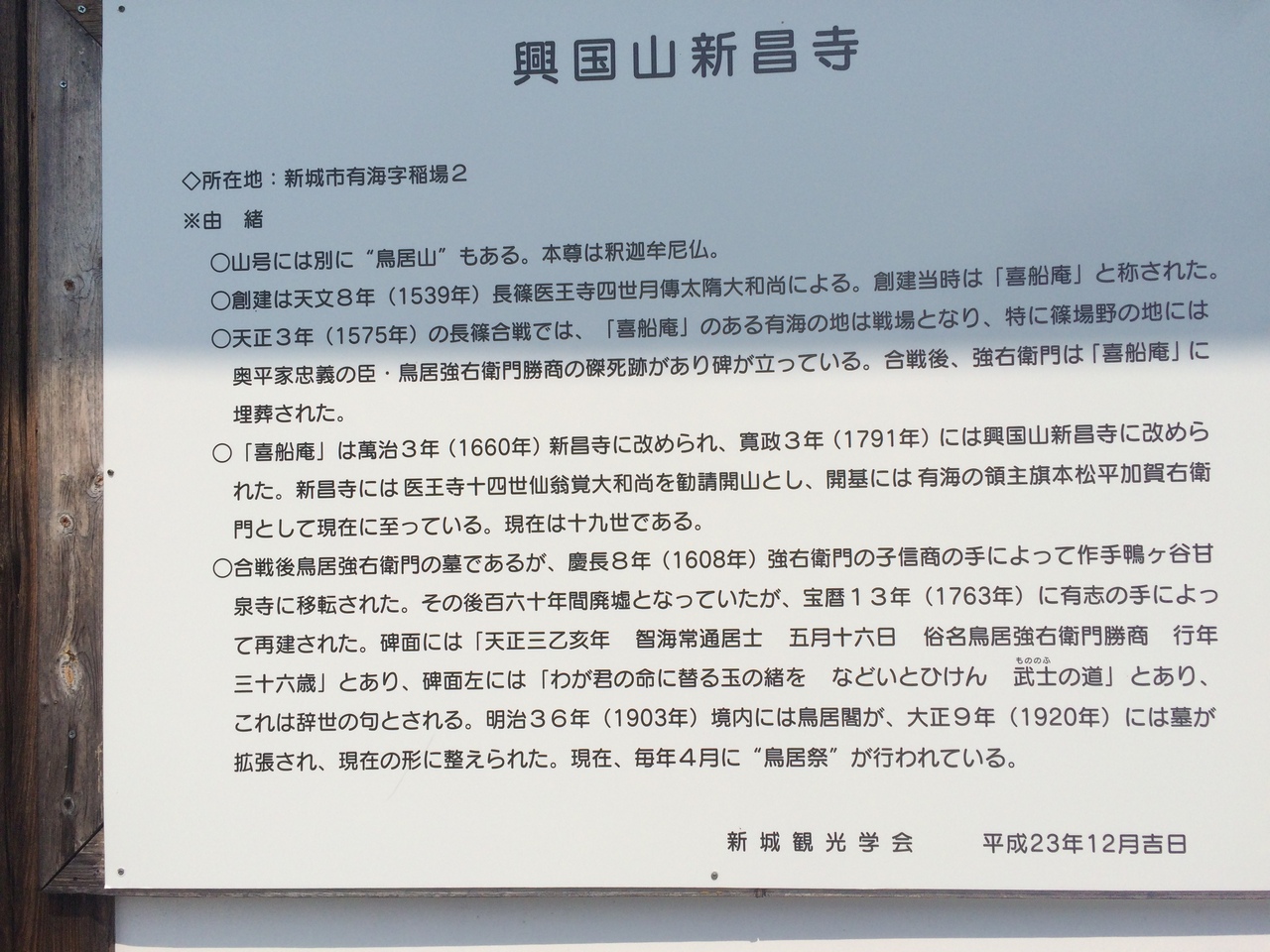 広い境内で砂利をひいた空間があります。長篠の合戦時の戦死者のお墓があり、また長篠の合戦の英雄、鳥居強右衞門墓もあります。新築したのか綺麗なお寺でしたが、長篠の合戦の戦死者のお墓と鳥居強右衞門の墓は歴史を感じさせ色あせていました。観光寺ではないですが、長篠の合戦の供養をする歴史マニアが幾人かいました。