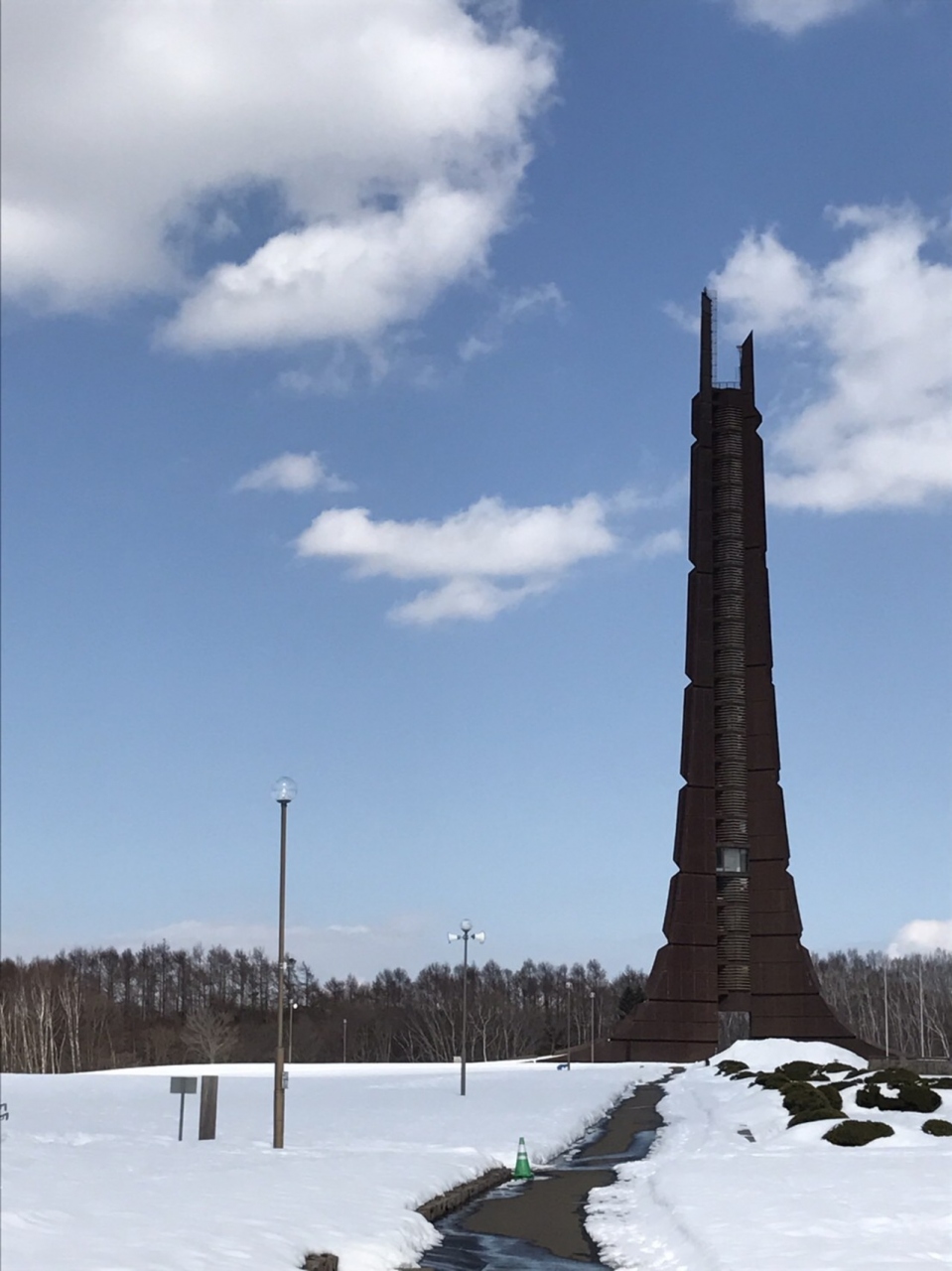 3月残雪があるけど歩道は雪解け進みます。百年記念塔
