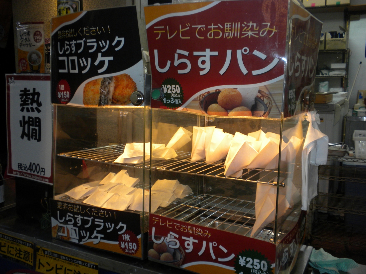 仕方ないので、近くの弁財天仲見世通り店の店頭で売られていた「しらすブラックコロッケ」と「しらすパン」をテイクアウト。