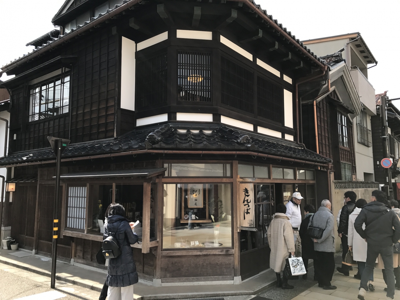 ひがし茶屋街のメイン通りの手前にある風情ある外観。「きんつば」という看板の文字がやけに気になりました。さっそく買ってみると、あずきがたっぷり甘さ控えめでとてもおいしかったです。一つ200円ぐらいで、意外に安かったのもグッドです。