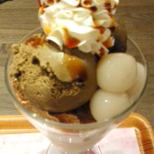 今回はほうじ茶白玉パフェを。ほうじ茶アズのアイスと寒天がたまらなく美味しい逸品でした。