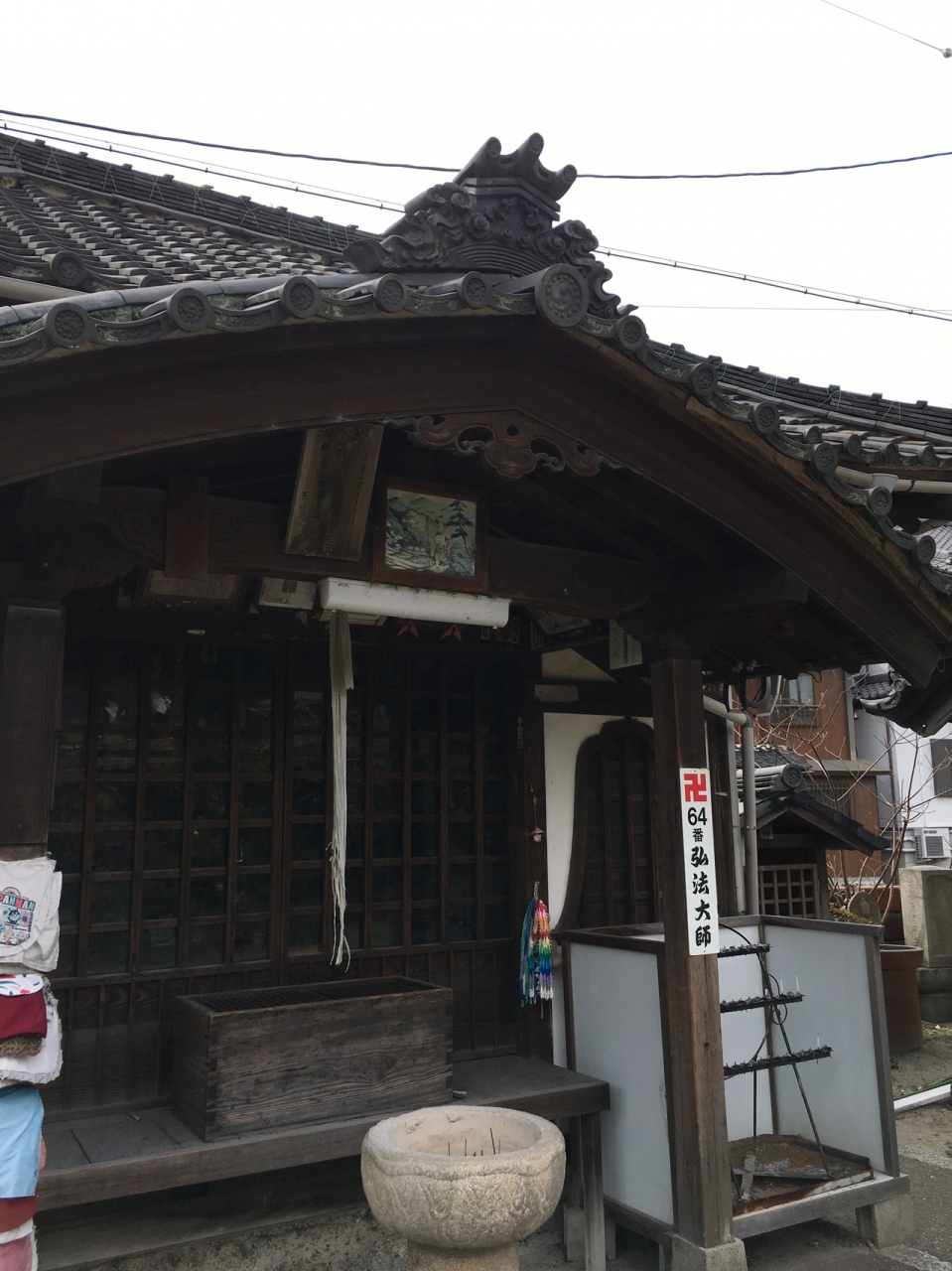 常滑市を観光で訪れ彫刻のある商店街を歩いていると、新四国六十四番札所の世昌山・宝全寺があり参拝しました。それほど大きな境内ではないですが、札所の本堂正面には弘法大師が描かれた額が飾られていました。
