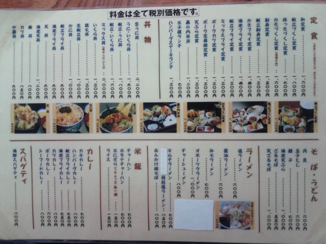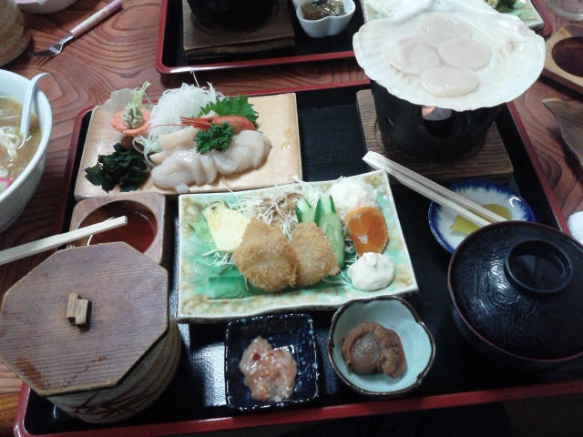 紋別の帰りに常呂町にある、レストハウスところで夕食を食べた。着いたのは夜7時半、国道238号線沿いにある。注文したのは人気の帆立づくし定食とカキづくし定食、子供には味噌ラーメン、他におこのみでうにとホッキを頼んだ。帆立もカキも量が多く、ご飯が足りないくらいでとても美味しかった。店内はテーブル席、小上がり席もある。