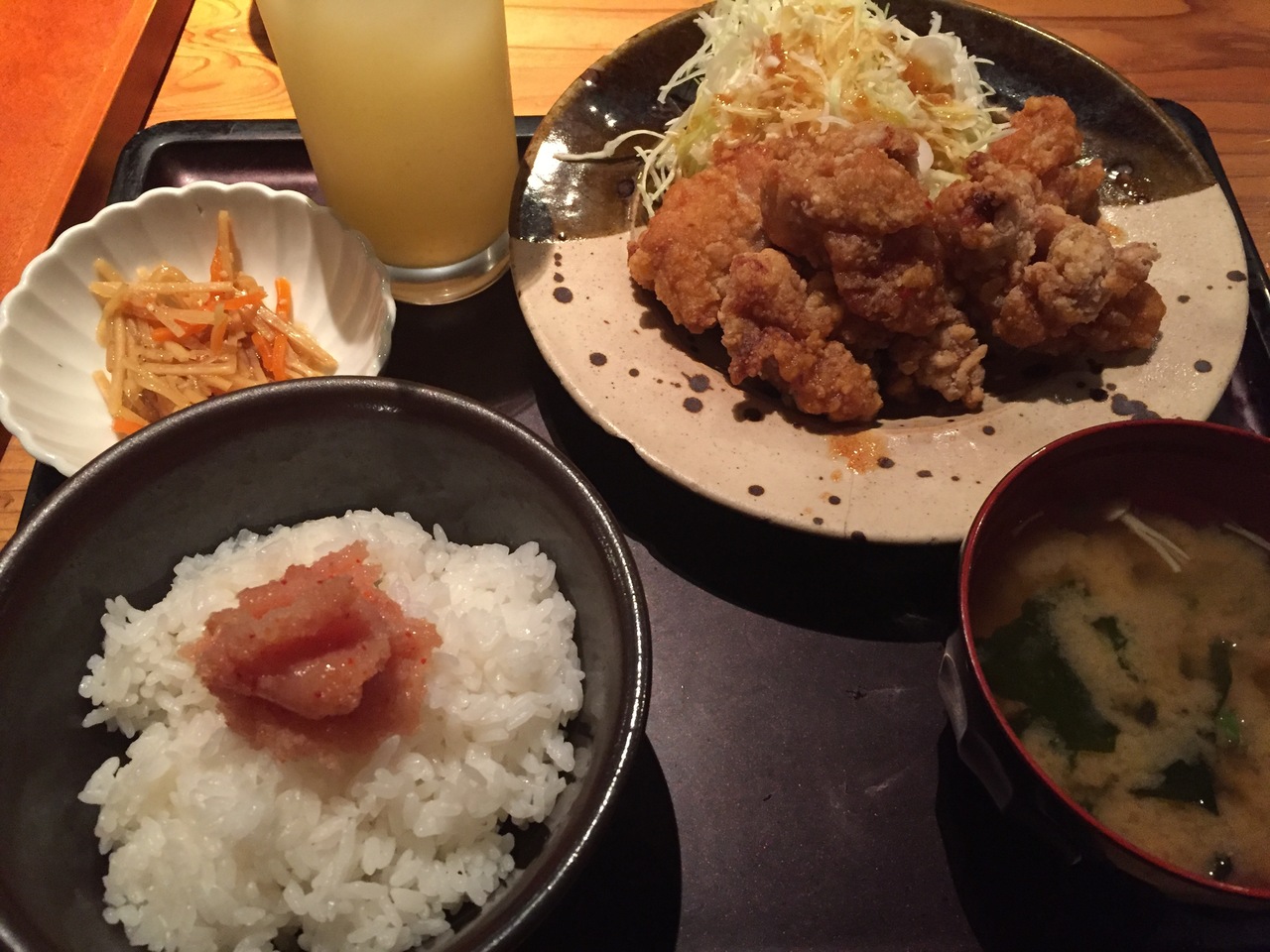 ランチはご飯、明太子、辛子高菜が食べ放題。メインは5種類から選べます。私は唐揚げを選択、メインの量は多いので男性でもお腹いっぱいになると思います。
