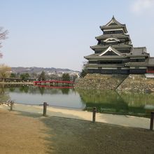 お堀越しに眺める松本城が美しく、水面に映る姿も乙なもの。